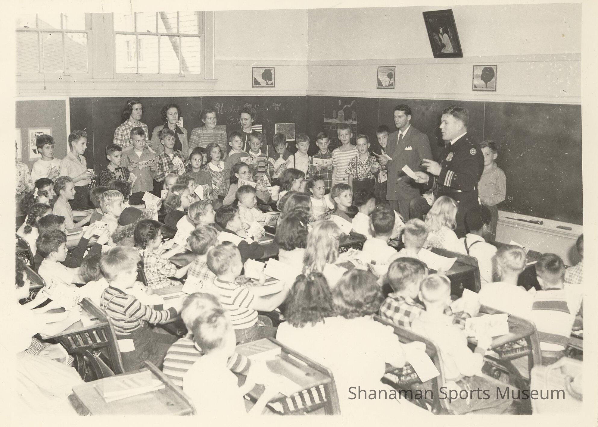 Jim Rondeau, wearing a suit and tie, stands next to a soldier in uniform as they talk before some elementary students at a local school during “United Nations Week.” Rondeau, who grew up in Tacoma, traveled the world refereeing some big-name fights and he refereed 19 world championship fights. In March 1974, he refereed the heavyweight championship fight between Kenny Norton and George Foreman in Caracus, Venzuela. Foreman beat Norton and went on to fight Muhammad Ali for the world titlt that year. Rondeau was also committed to doing amateur fights and over the years was a familiar face at the Tacoma Golden Gloves tournaments.Lexicon