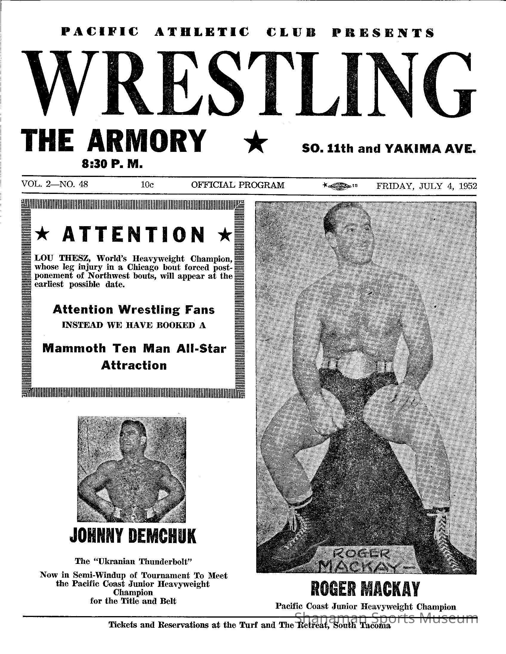 Souvenir program from the Armory for Pacific Athletic Club Wrestling; pink bifold with Roger Macay and Johnny Demchuk on the front cover. July 4, 1952.