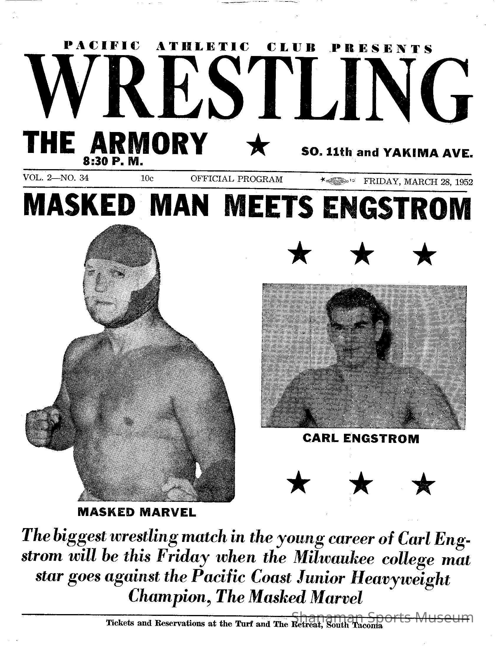 Souvenir program from the Armory for Pacific Athletic Club Wrestling; pink bifold with Masked Marvel vs Carl Engstrom on the front cover. March 28, 1952.