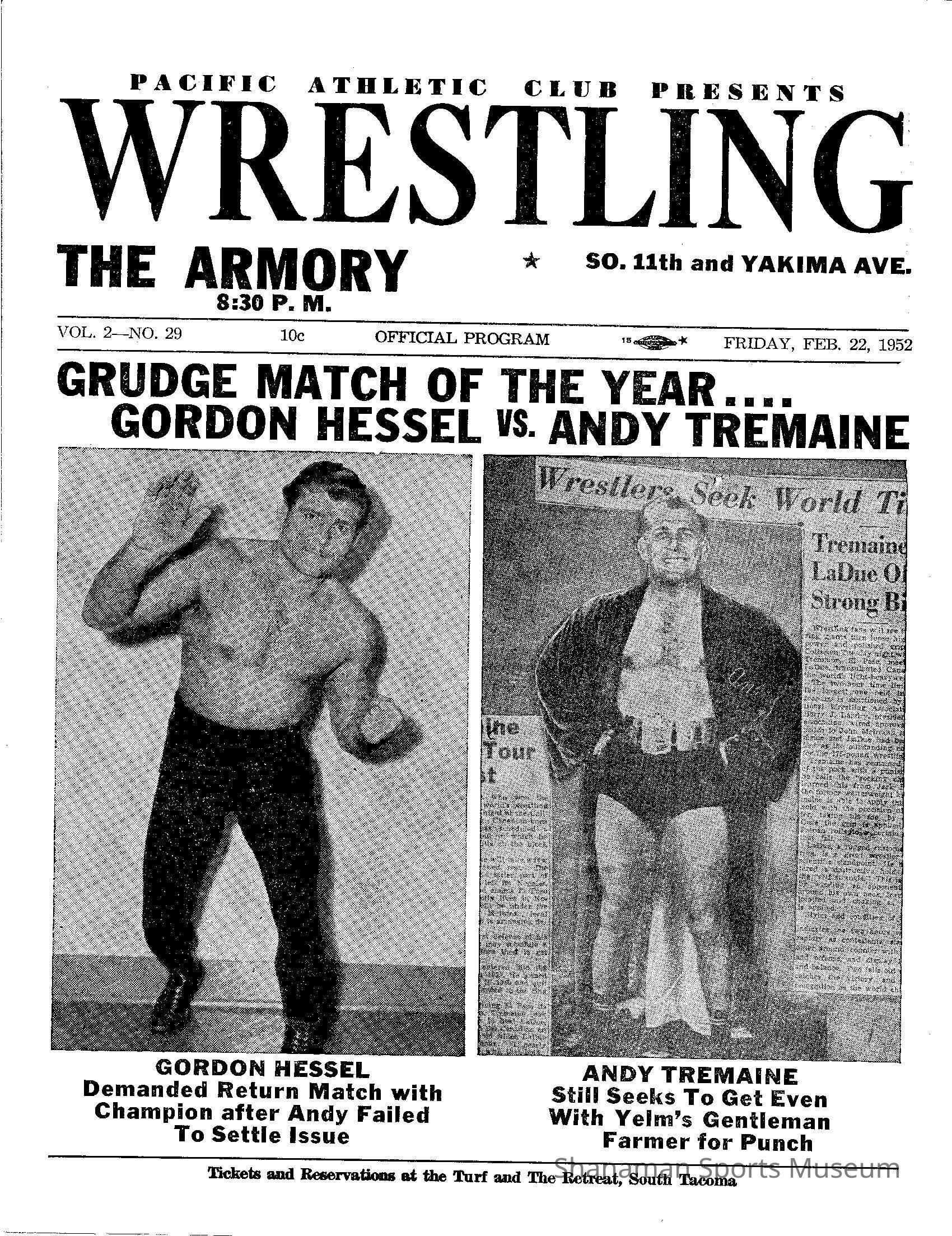 Souvenir program from the Armory for Pacific Athletic Club Wrestling; yellow bifold with "grudge match of the year" - Gordon Hessel vs Andy Tremaine on the front cover. February 22, 1952.