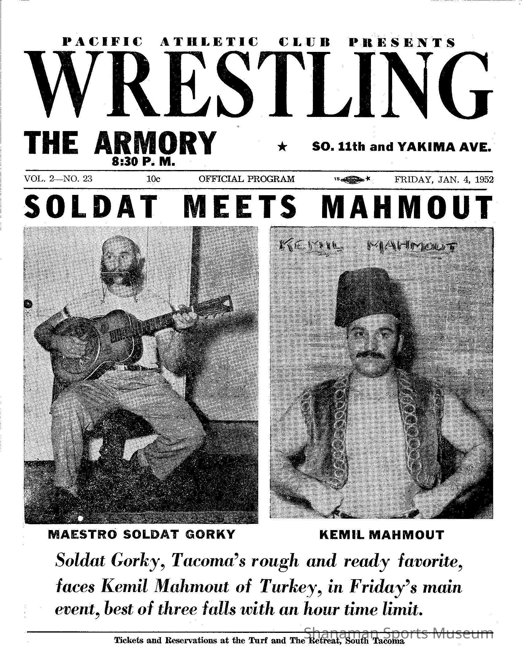 Souvenir program from the Armory for Pacific Athletic Club Wrestling; pink bifold with "Soldat meets Mahmout" Maestro Soldat Gorky vs. Kemil Mahmout on the front cover. January 4, 1952.