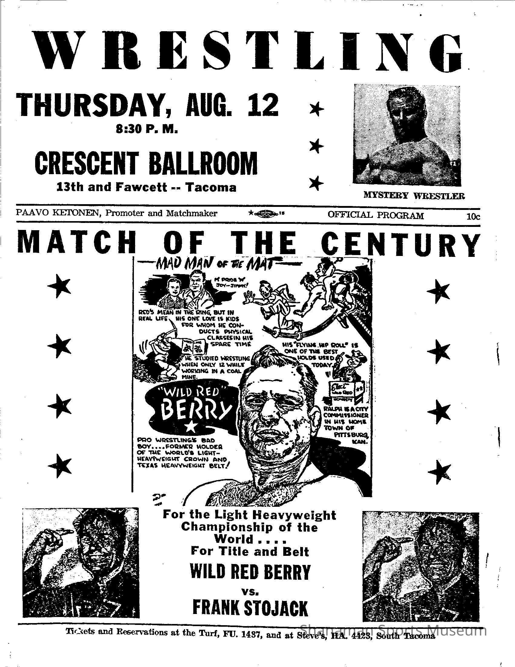 Souvenir program from the Cresent Ballroom for Pacific Athletic Club Wrestling; pink bifold with "Match of the Century" between Wild Red Berry vs Frank Stojack on the front cover. August 12, 1952.