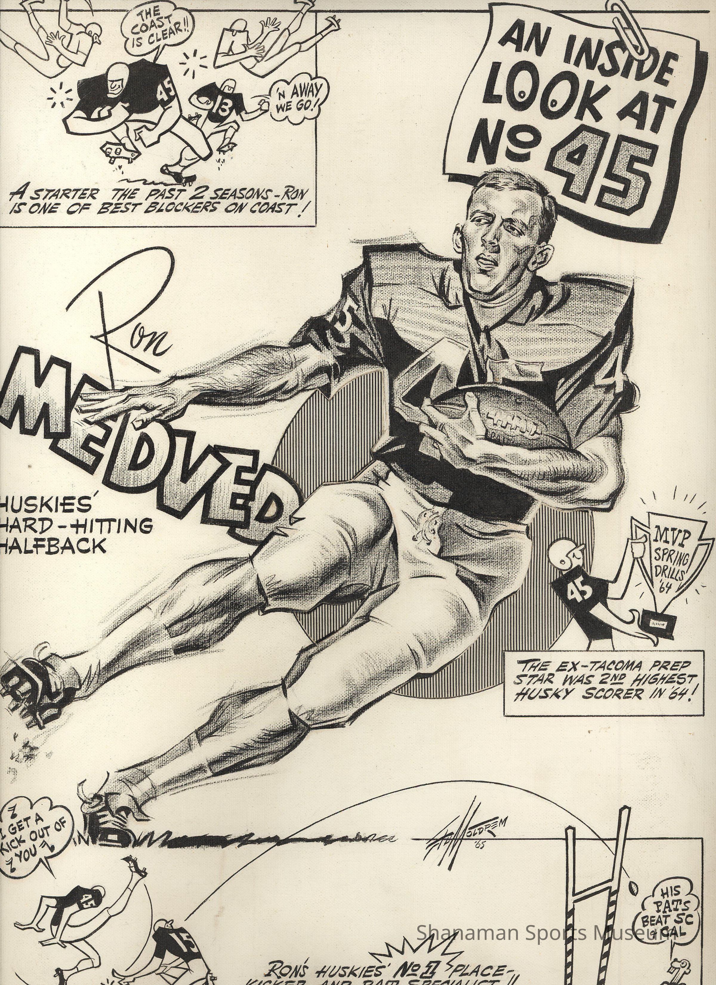 LOAN -Caricature of Ron Medved while playing football for the University of Washington. - "An inside look at No. 45" "Ron Medved" "Huskies hard-hitting Halfback".
