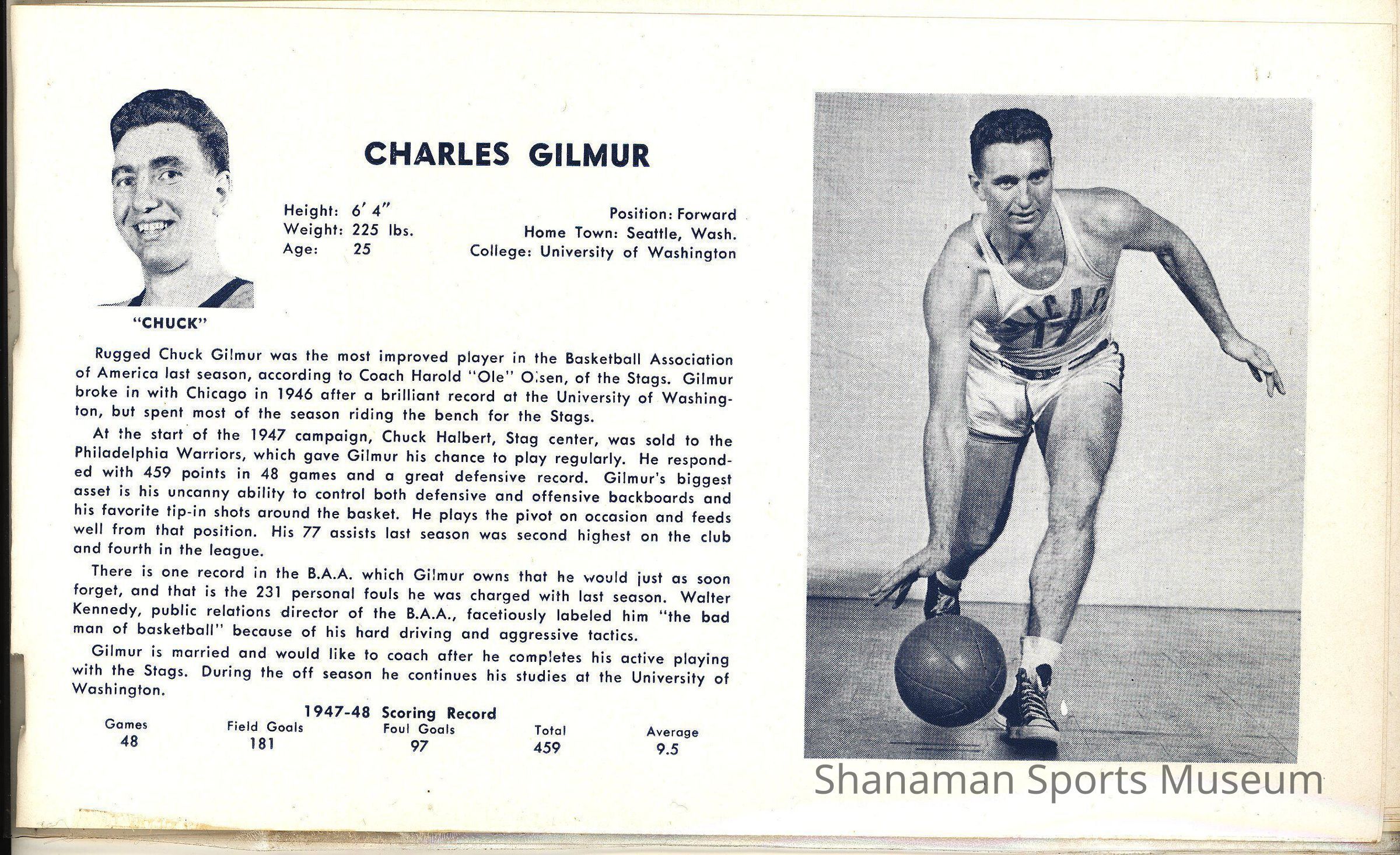 Media guide of Chicago Stags 1948-1949 with a profile of Chuck Gilmur
