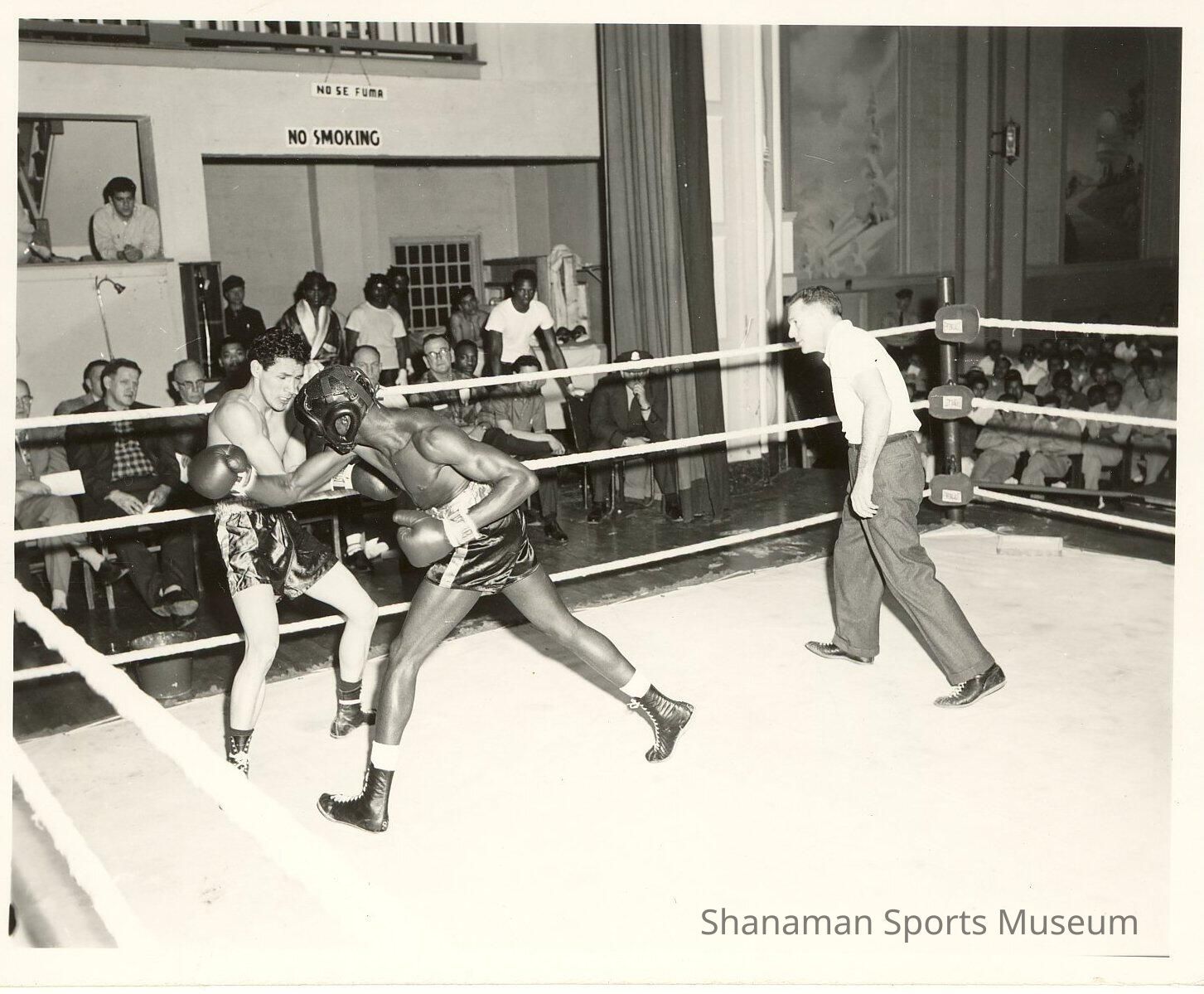 In this local amateur fight, two young fighters exchange blows as Tacoma's Jimmy Rondeau looks on as he referees the bout. As a referee, Rondeau traveled the world and did 19 world championship fights. In addition to refereeing professional and amateur fights, Rondeau was appointed to the Washington State Boxing Commission in 1962. He held that position for 16 years. In 1966, Rondeau was elected to the International Boxing Federation and was responsible for training and evaluating referees and judges. He held that position for 36 years and traveled the world, going to Athens, Greece, Buenos Aires, Puerto Rico, Jamaica and Hong Kong. Refereeing wasn't his primary job. He worked for Foss Launch and Tug, negotiating union contracts with the shipbuilders.Lexicon