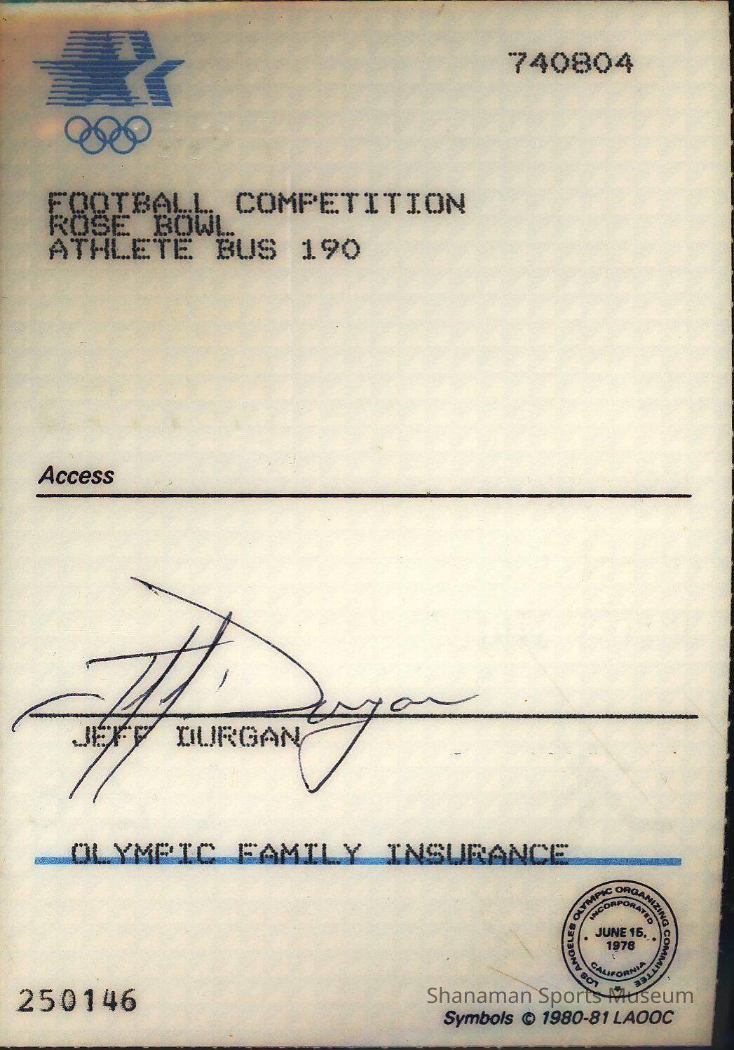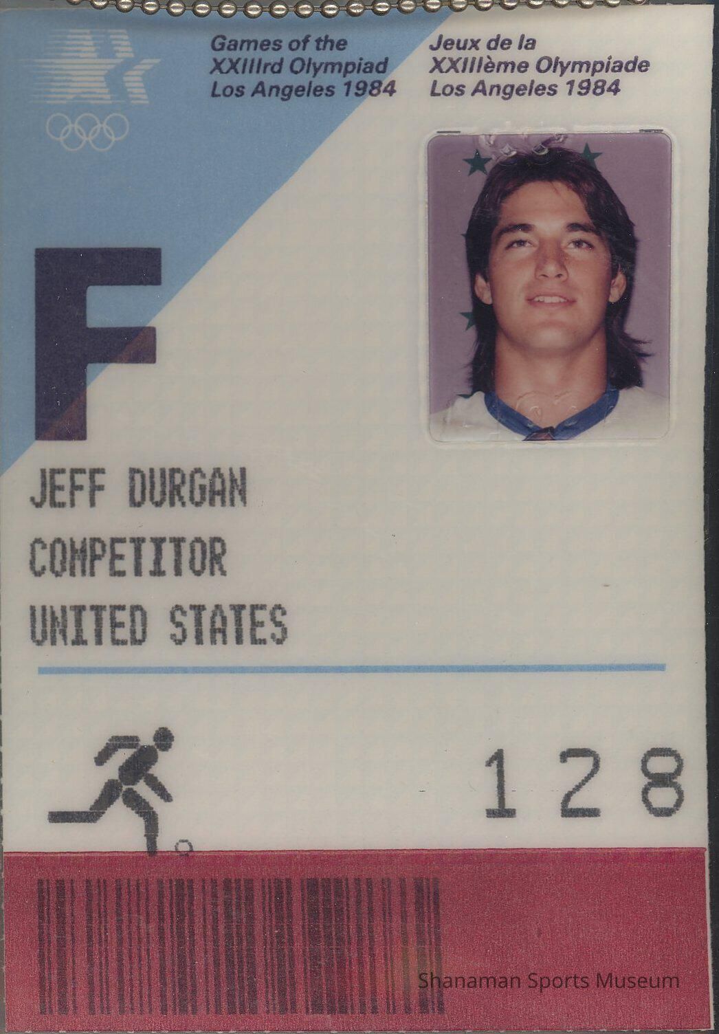 ID card for Jeff Durgan,color photo - for 1984 Olympiad. Summer Olympics held at Los AngelesLexicon