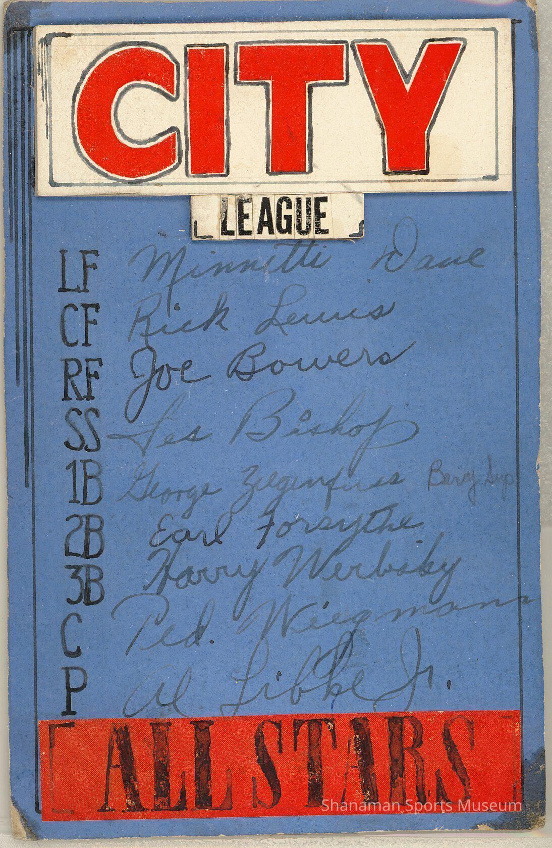 Lineup card of the City All Stars; blue; LF-Dave Minnitti, CF-Rick Lewis, RF-Joe Bowers, SS-Les Bishop, 1B-George