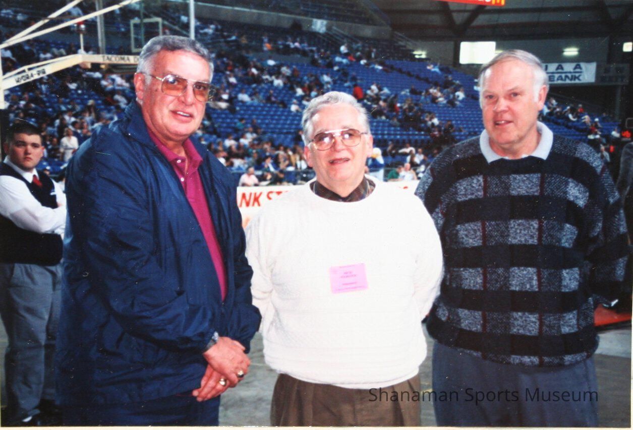 Dick Webster, a 1948 graduate of Tacoma's Lincoln High School and a longtime referee, stands with two other men for this color photo. Bob Bafus is on the left in the photo, Webster is in the middle and Jake Mayberry is on the right. Webster was a three-year letterman in football and basketball at Lincoln. He played on a Navy championship team in baseball, fastpitch, basketball and slowpitch. In 1958, Webster played on Tacoma's Woodworth Contractors baseball team and came up one run shy of the national American Amateur Baseball Congress championship. He officiated baseball, basketball and football. Bafus was a longtime boys basketball coach at Colfax High School and was just the third coach to win over 600 games in their careers. He coached at Colfax for over 40 years. Mayberry was a longtime high school boys basketball coach and led Lynden High School to four state titles. He was inducted into the WIAA Hall of Fame in 2007.Lexicon