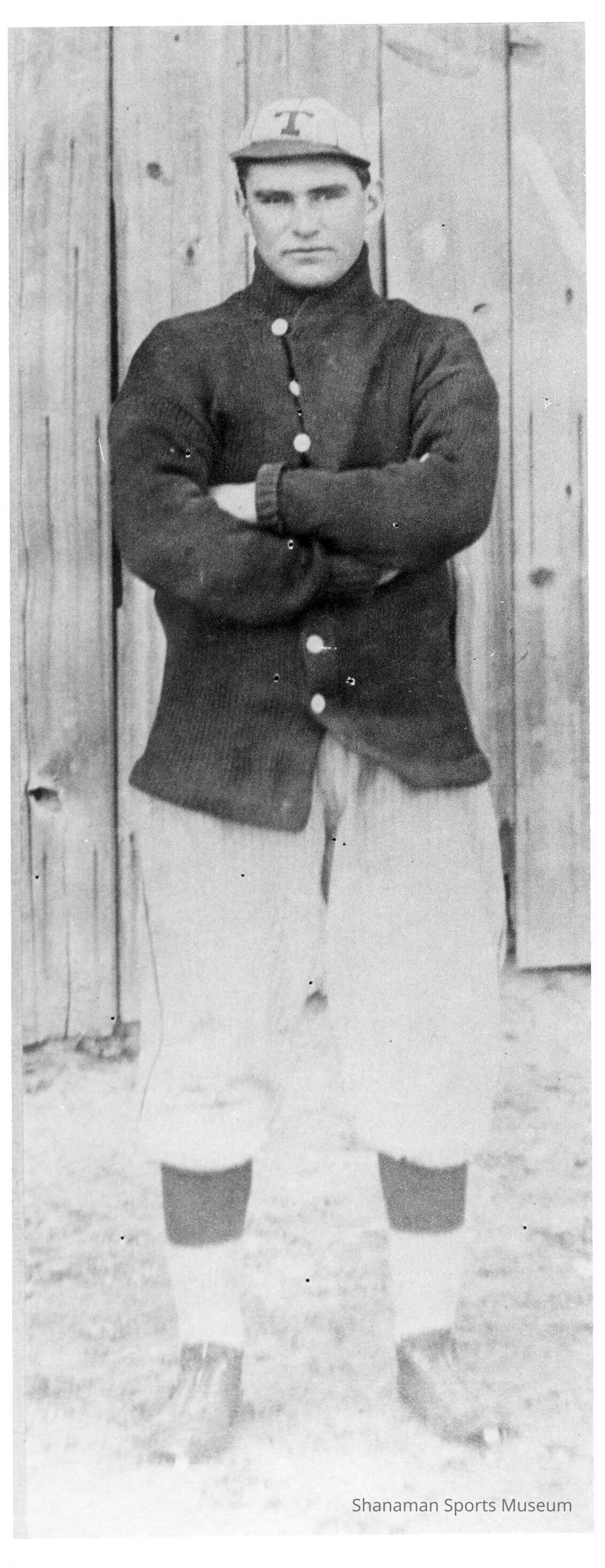 Bert Hall wears a Tacoma cap, a dark button-up jacket and light pinstriped baseball pants in an undated photograph.