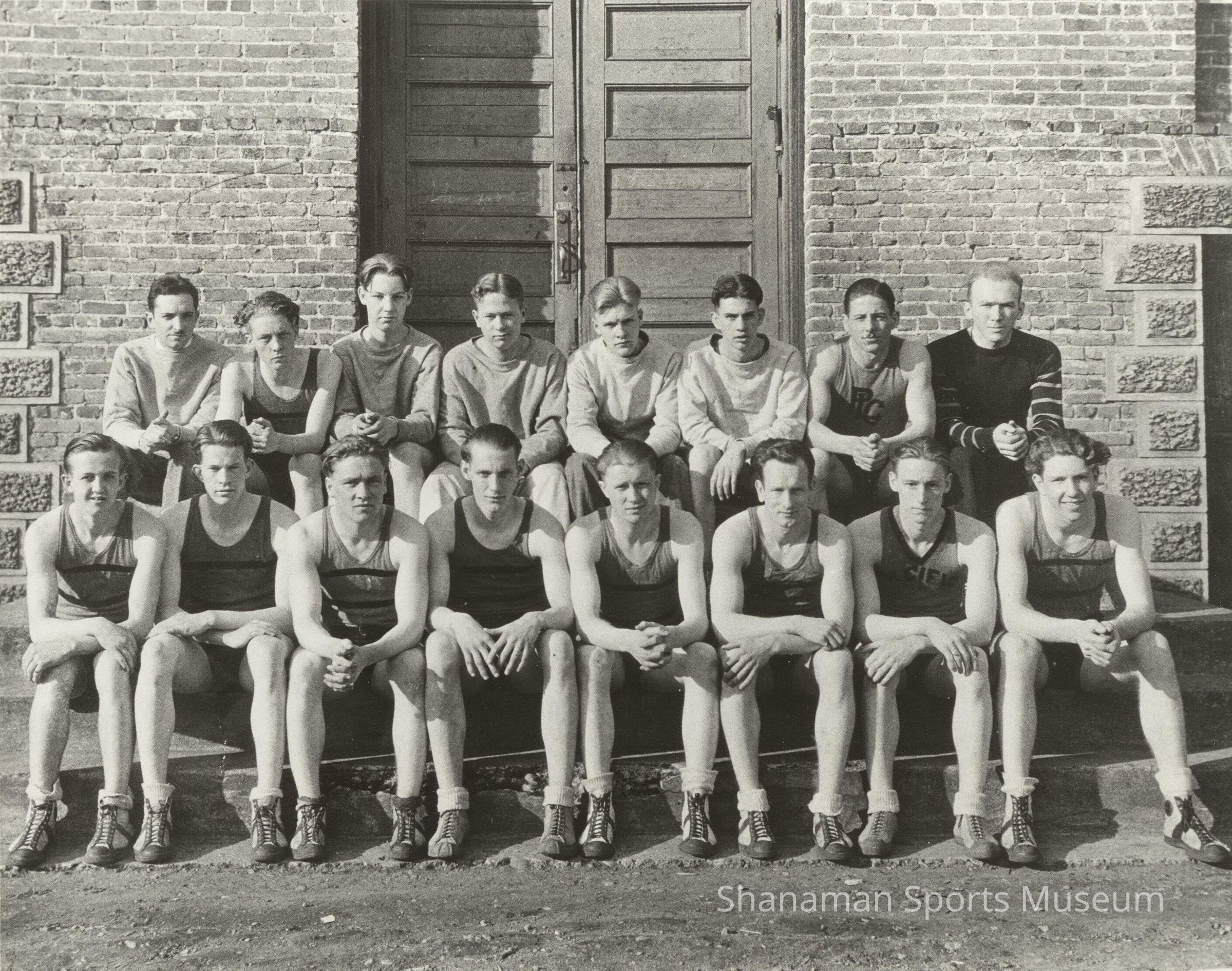 Fifteen members of Pacific Lutheran College track and field team pose with coach Cliff Olson (back row, right) in an undated photograph.