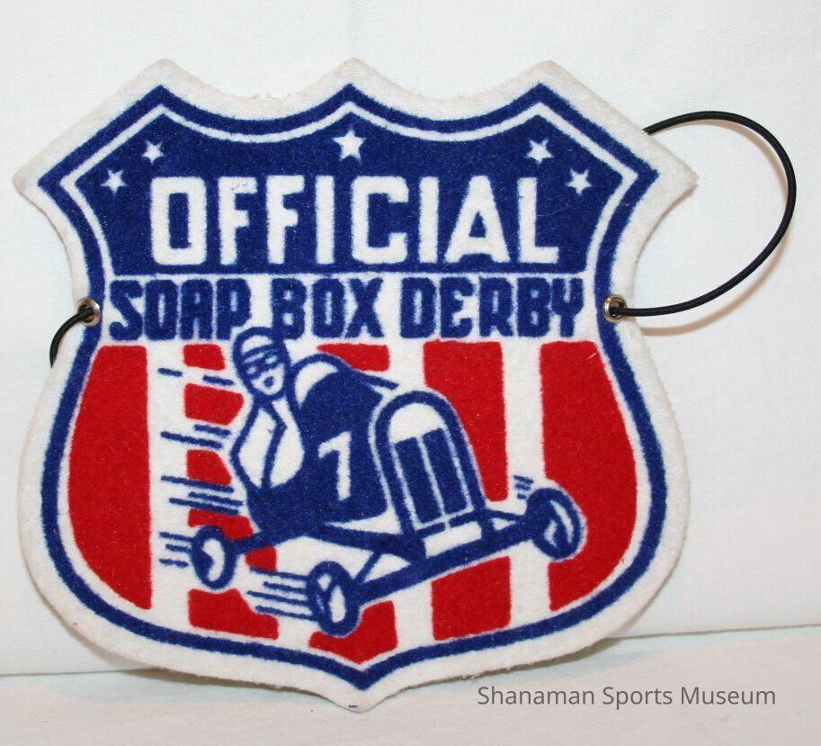 Patch, official Soap Box Derby - white felt w/ red & blue print. Silhouette of soap box car with "Official Soap Box Derby" label