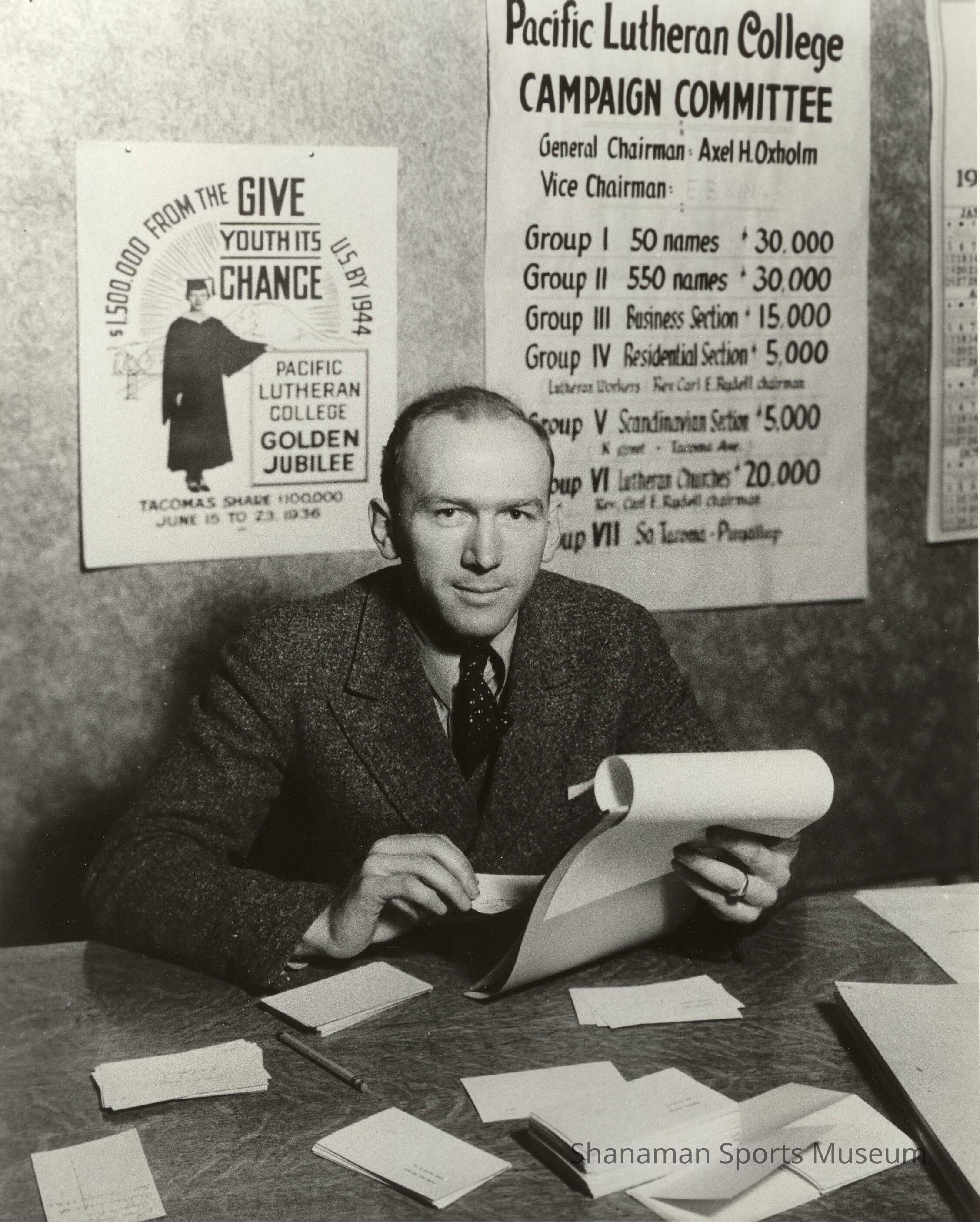Cliff Olson, sitting at a desk with posters on the wall behind him, held nearly every job in the athletic department of Pacific Lutheran College (renamed Pacific Lutheran University in 1960).