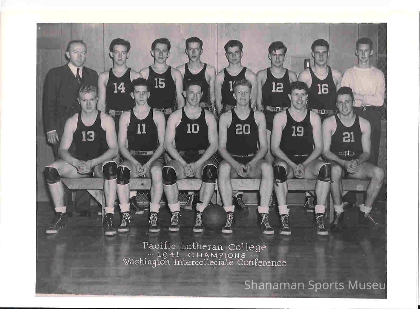 The 1941 Pacific Lutheran College's basketball team poses for a team photo after they won the Washington Intercollegiate Conference championship. Marv Harshman is third from the left in the front row wearing number 10. Harshman went on to a prominent career coaching and became one of the country's top coaches. He began his illustrious coaching career at Pacific Lutheran and went on to coach basketball at Washington State University and the University of Washington. In his 40-year coaching career, his teams won 642 games. Harshman coached at PLC from 1945 to 1958 before moving on to WSU and UW. Cliff Olson stands in the back row (to the left).