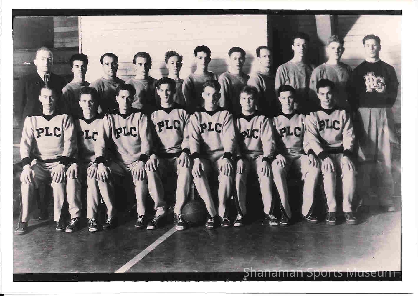 Team photo from the 1940s of Pacific Lutheran College's men's basketball team wearing their warmups prior to a practice. Cliff Olson is on the left in the back row and was a legendary coach at PLC. In addition to coaching basketball, Olson also coached football, baseball, golf, tennis and track. Olson coached football at PLC for 14 years and compiled a 64-33-6 record and won 18 straight games between 1939 and 1941. In addition to coaching, Olson was also the Lutes' athletic director. Olson has been inducted into PLU's athletics hall of fame.Lexicon