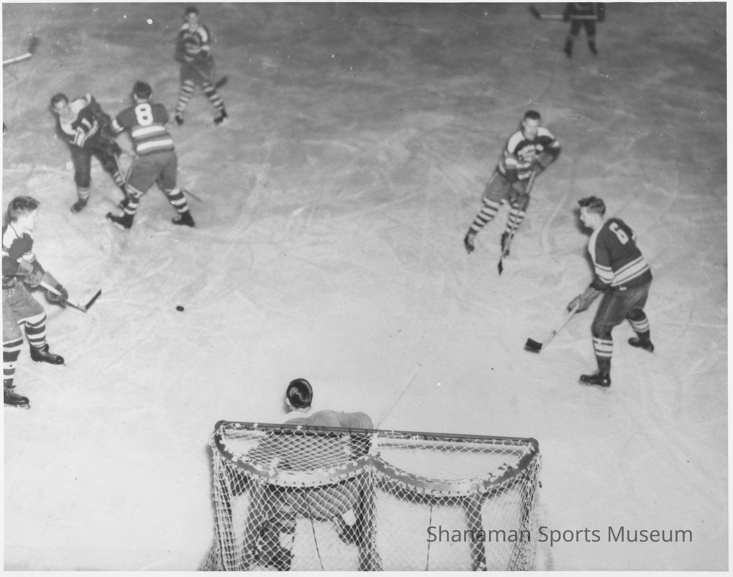 A view from above the goal shows players during a Tacoma Rockets hockey game against Seattle at the Lakewood Ice Arena in the 1940s-50s. The Rockets were a professional team that played in Tacoma from 1946 to 1953. Tacoma played in the Pacific Coast Hockey League until becoming a member of the Western Hockey League during the 1952-53 season and relocating to the Tacoma Ice Palace.