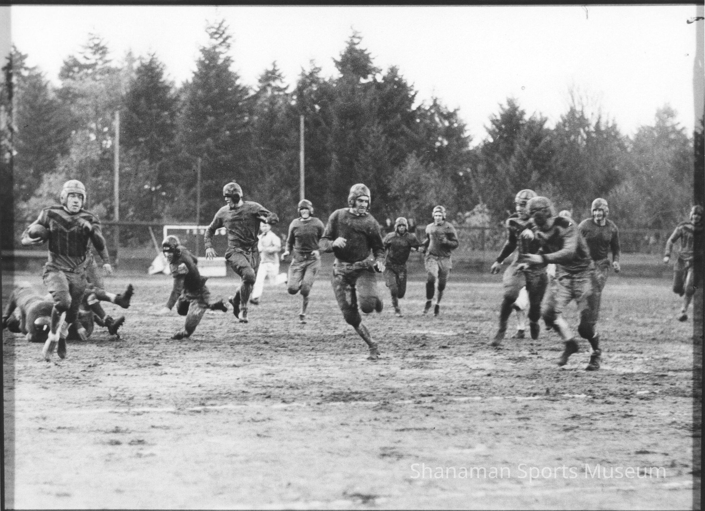 n this black-and-white photo taken back in the 1920s, football players wearing leather helmets try to tackle a running back in a local high school football game. Leather helmets were not made mandatory in the NFL until 1943. The 1920's are often referred to as the “Golden Age” of American sports. With more free time and better transportation, sports became a more popular alternative. Tacoma's Lincoln Bowl and Stadium became popular venues for sporting events.Lexicon