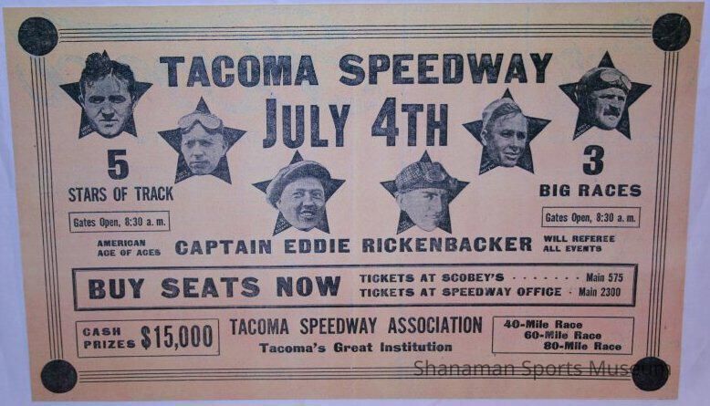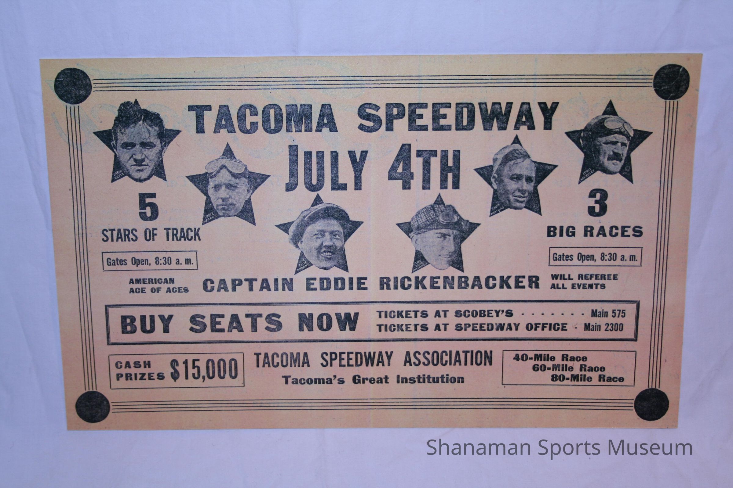 Newspaper clipping, "Tacoma Speedway July 4", advertising Eddie Rickenbacker at the Tacoma Speedway in the 1920's.Lexicon