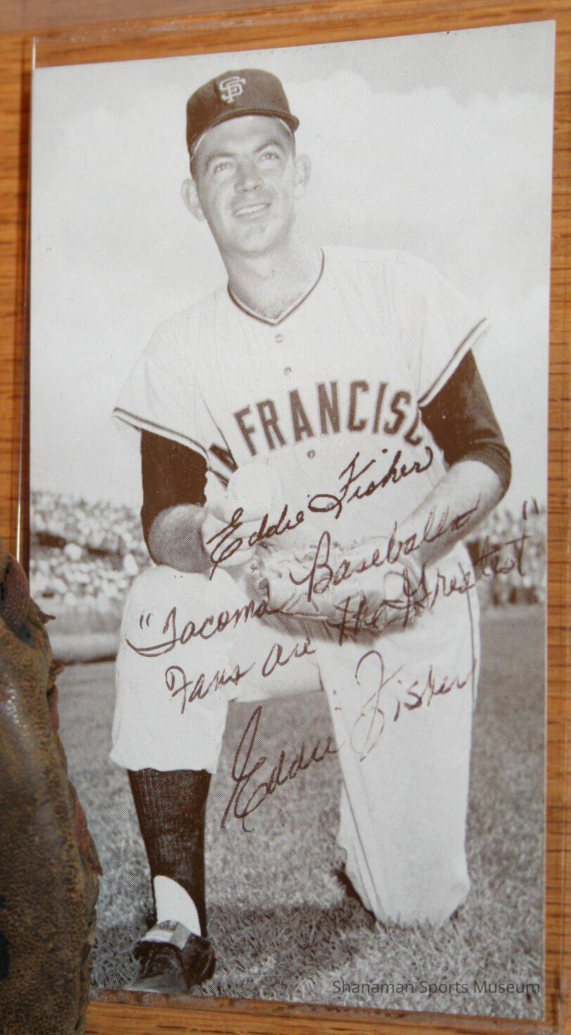 Postcard of Eddie Fisher a long time pitcher for the Tacoma Giants. It is signed "Eddie Fisher Tacoma Baseball Fans are the Greatest Eddie Fisher"