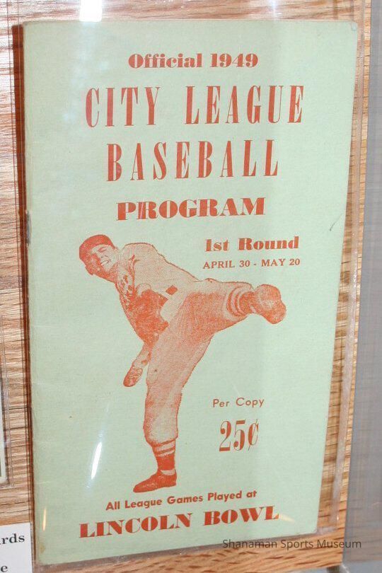 Program - 1949 city league baseball program; Lt. green cover w/ red printing. Shows picture of player pitching.