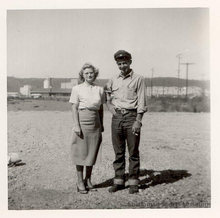B/W original print, snapshot; Merle & Ira Webster stand in parking lot; Farm buildings & Telephone poles in backgroundLexicon