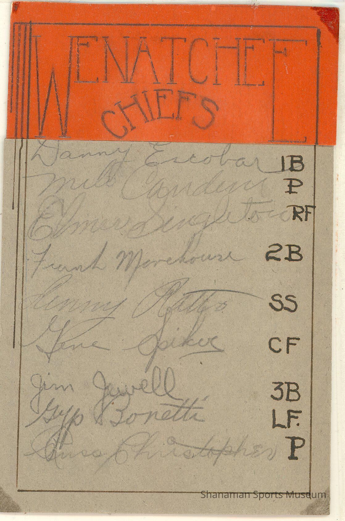 Lineup card of the Wenatchee Chiefs/played in the Western International League from 1939-41 period; orange/gray
