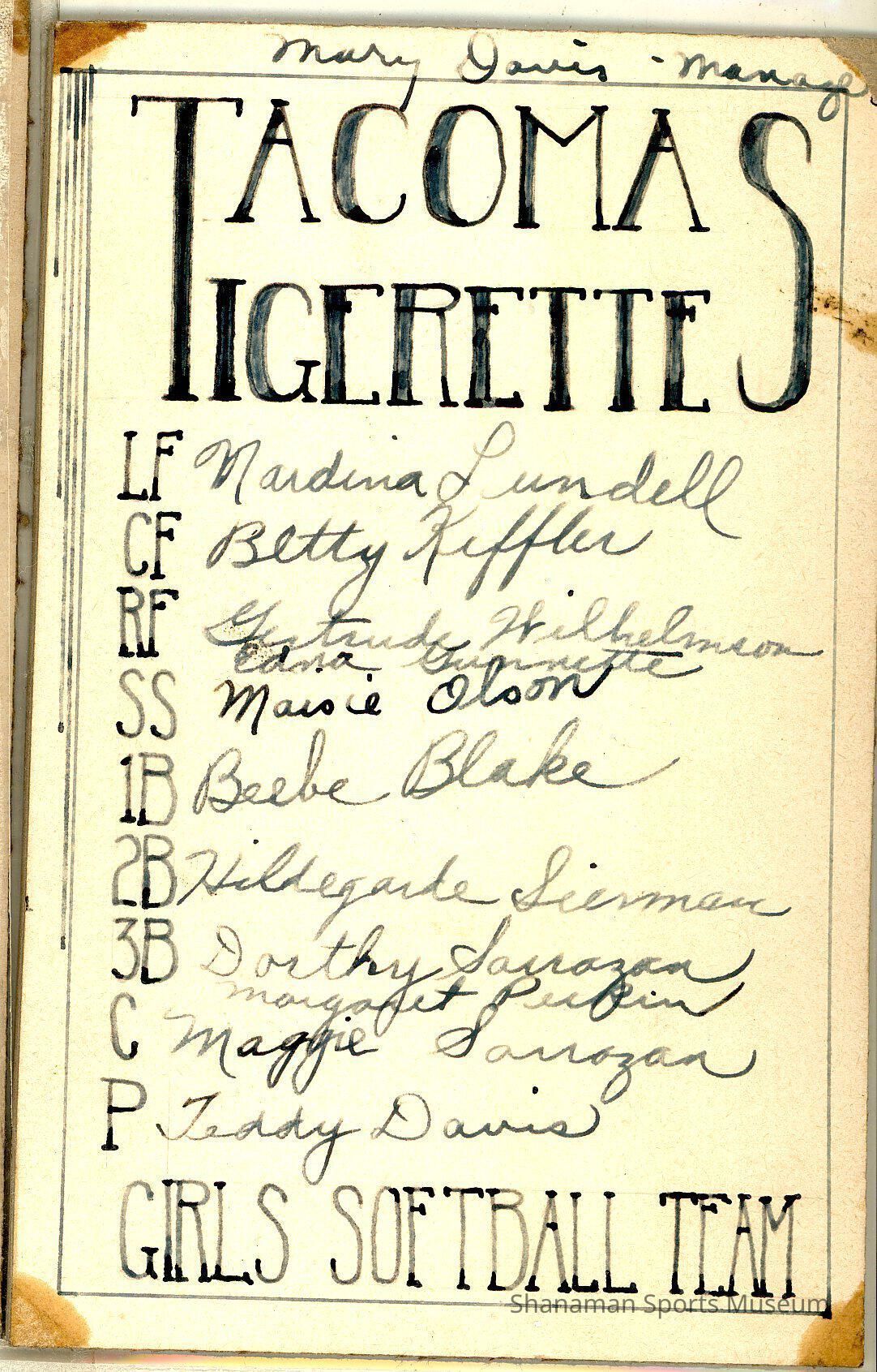 Lineup card of the Tacoma Tigerettes-girls softball team here in Tacoma. The most recognizable name was outfi
