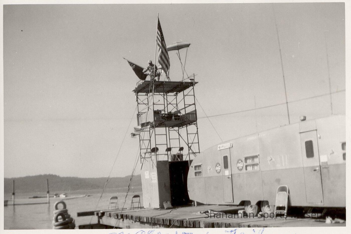 A travel trailer named " Magnuson Trailer" is by a judge's grandstand on a wooden dock for the U-19 Coral Reef hydroplane, believed to be at Lake Chelan.