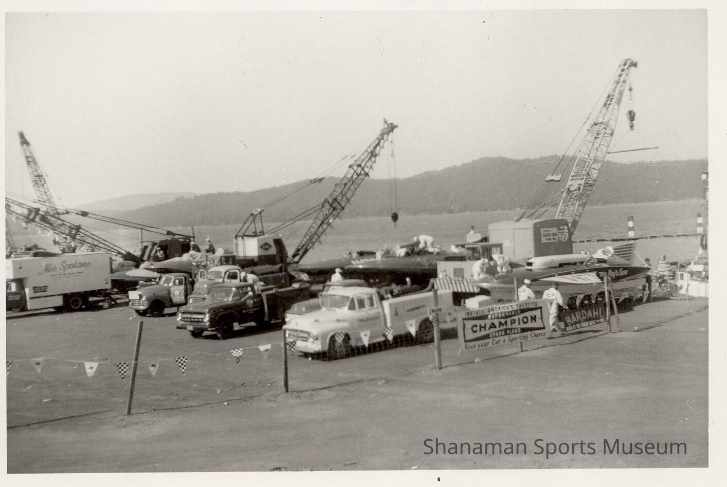 B/W original print, snapshot of several hydroplanes on trailers. 5 cranes visible, each used to lift hydroplanes into water; maybe Lake ChelanLexicon