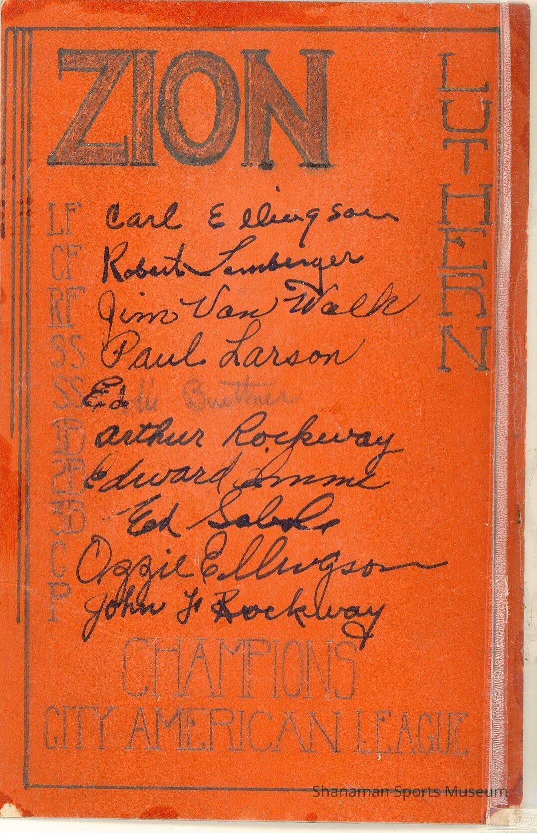 Lineup card of the Zion Lutheran Baseball team; reddish/orange.
