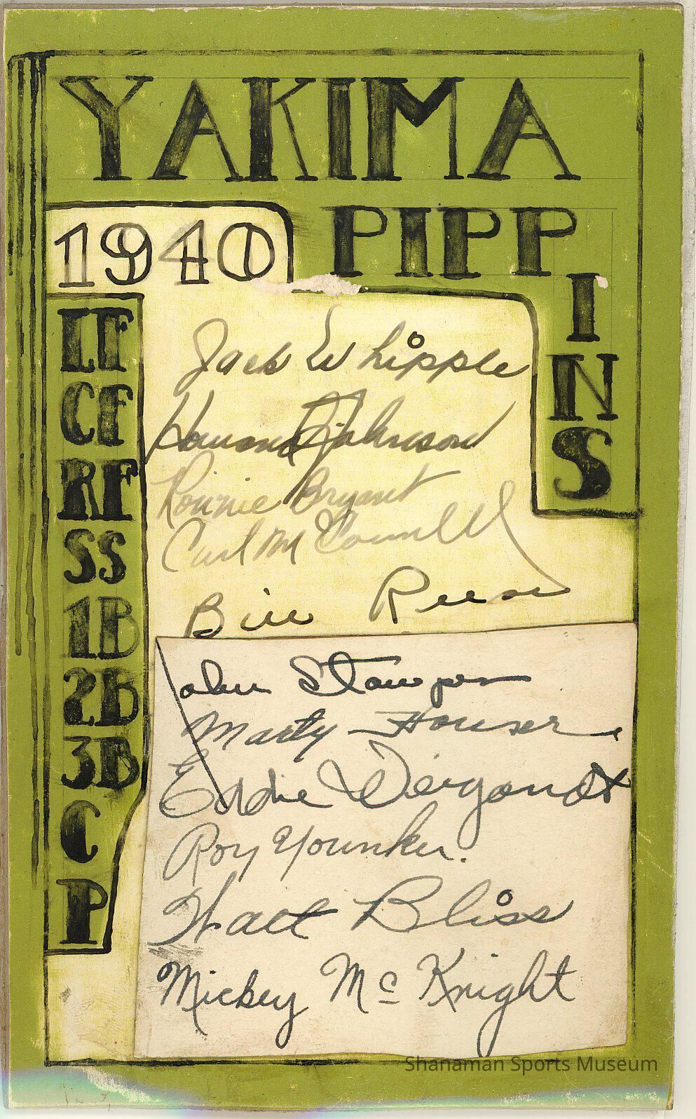 1940 lineup card from the Yakima Pippins of the Western International League; green/lt. yellow