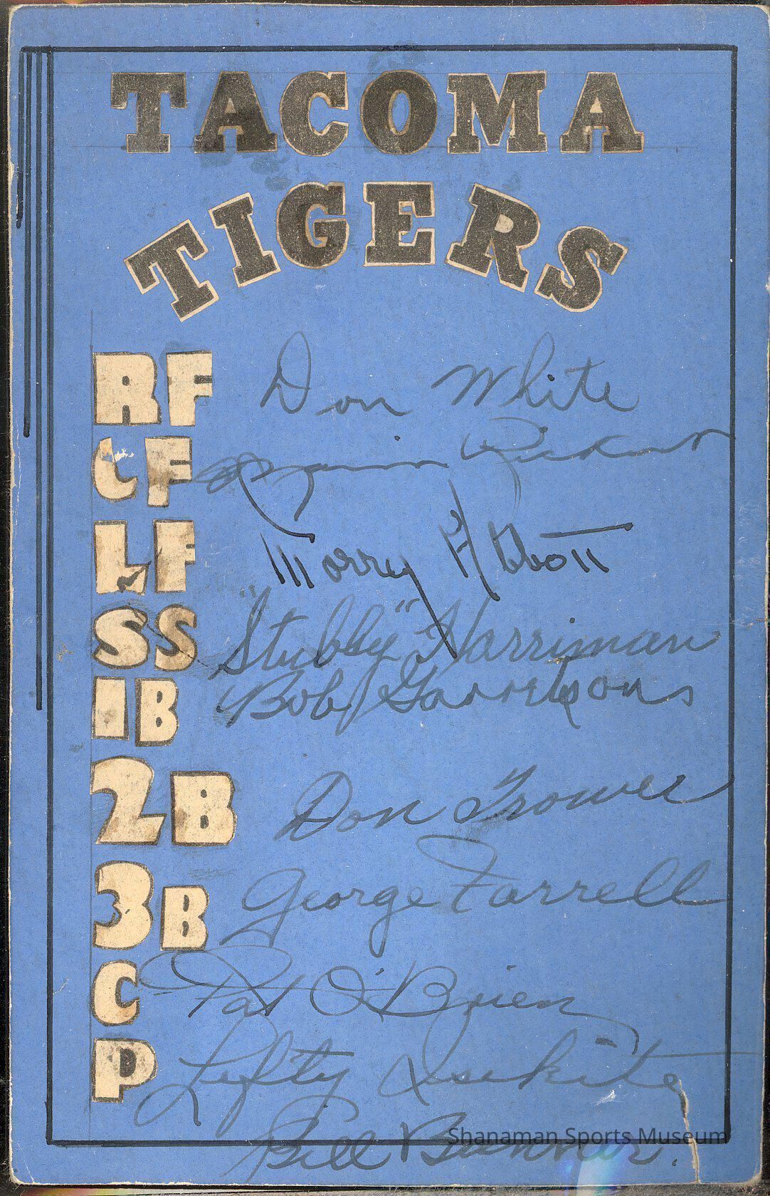 Blue lineup card for the Tacoma Tigers, and it appears to be from about the 1940-41 season.