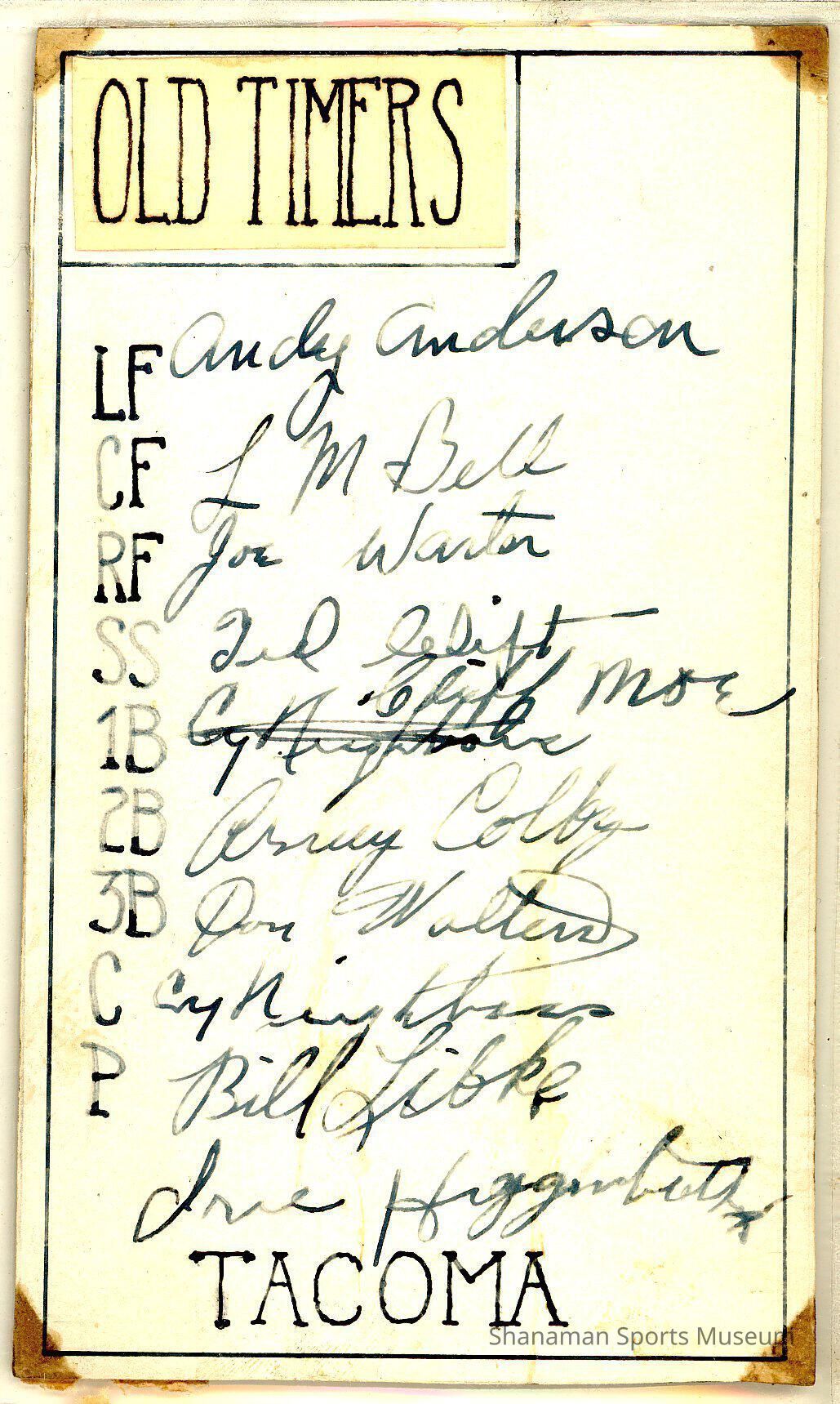 Lineup card of the Tacoma Old timers , Cy Neighbors, Bill Libke, around 1915-1916 period