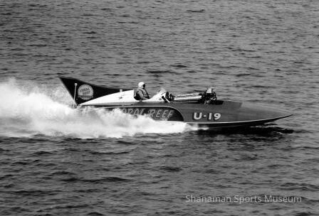 B/W original print, hydroplane Coral Reef; "U-19: on starboard, "Coral Reef Oil Co." on tail; driver with helmet in cockpit.Lexicon