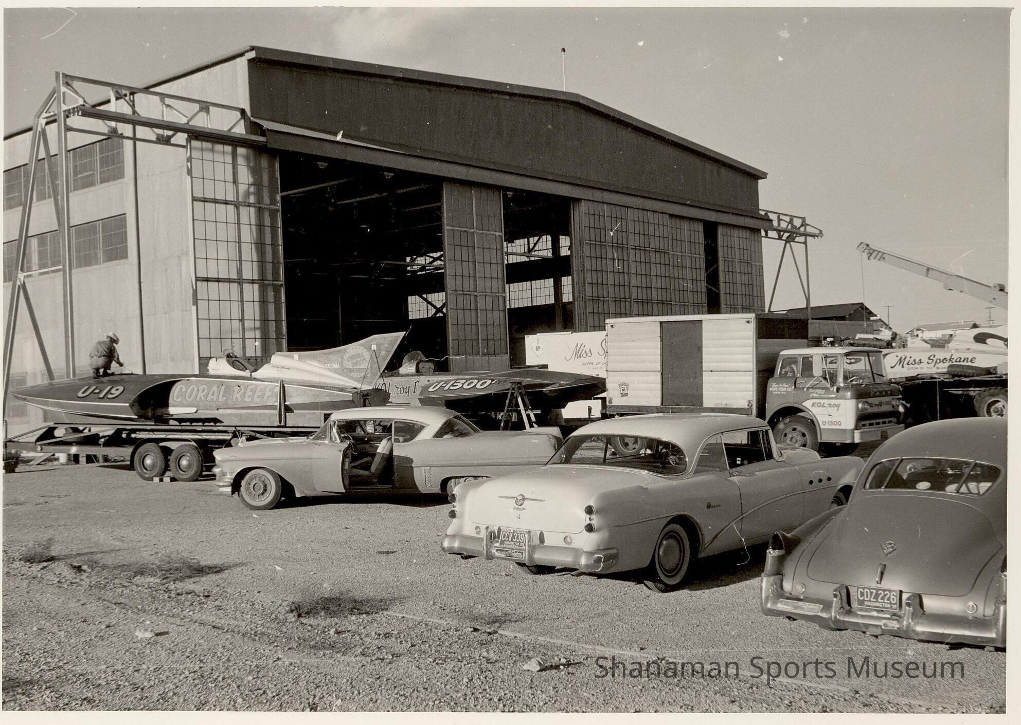 B/W original print. Hydroplane "Coral Roof" on trailer in parking lot near Lk. Mead. Large hanger building in background; "Miss Spokane" also visible.Lexicon
