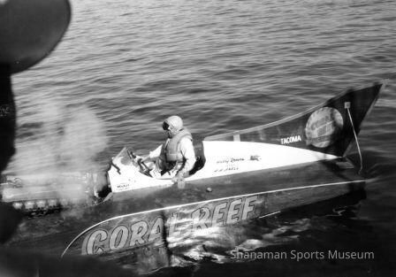 B/W original print, snapshot, "Coral Reef" profile view, taken from dock. Boat appears to be overheating "Harry Reeves" as driver.Lexicon