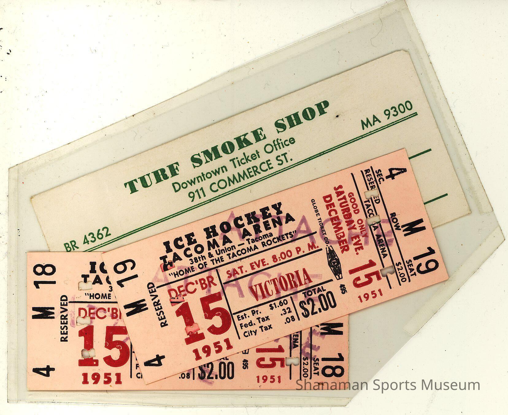 Tickets- two tickets (a,b) and ticket envelope (c) for the Tacoma Rockets hockey team from the 1951 season. Tickets were for December 15, 1951 against Victoria at the 38th Street Ice Arena.Lexicon