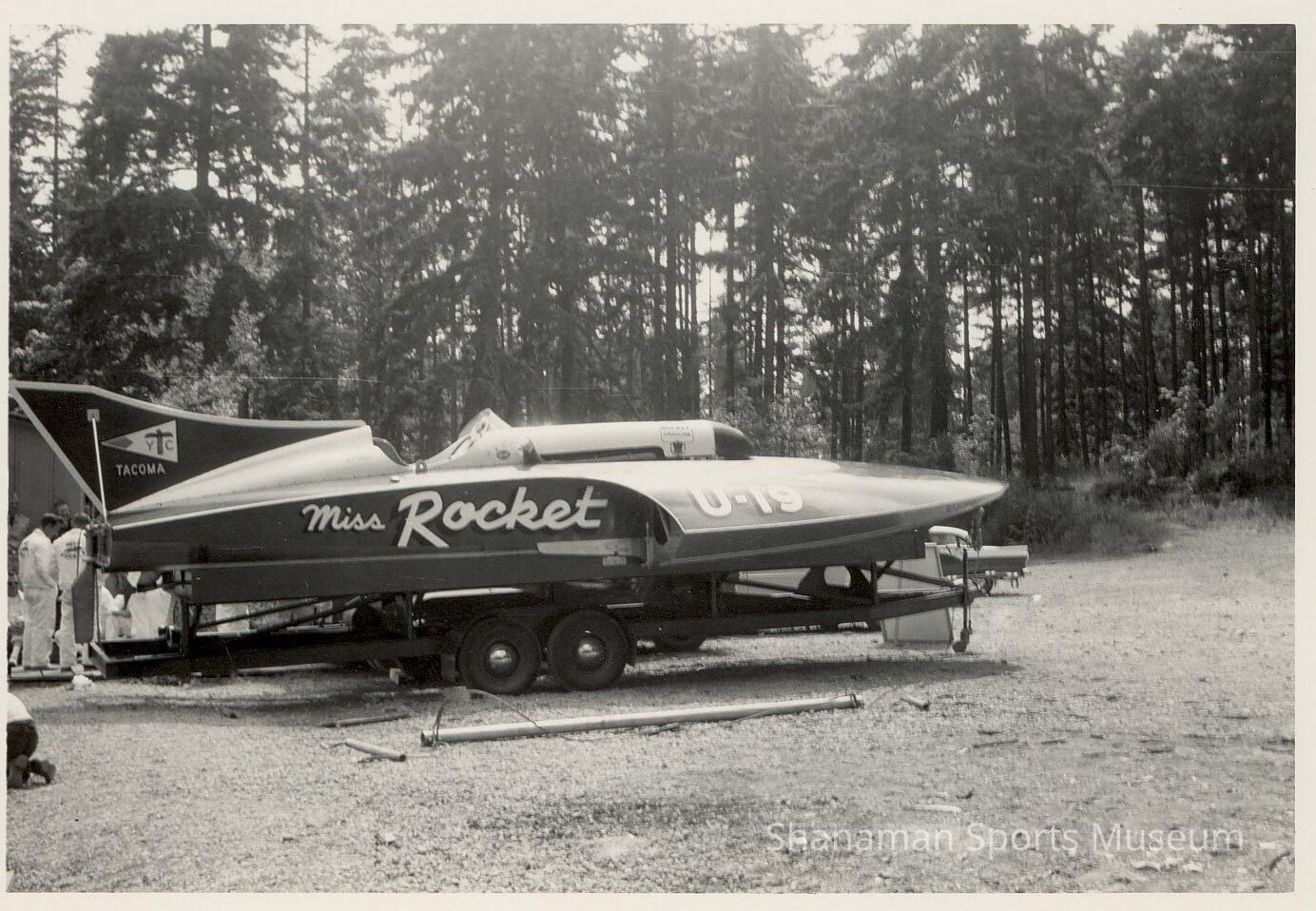B/W original print, "Miss Rocket" profile on trailer; men at stern of boat at ground level