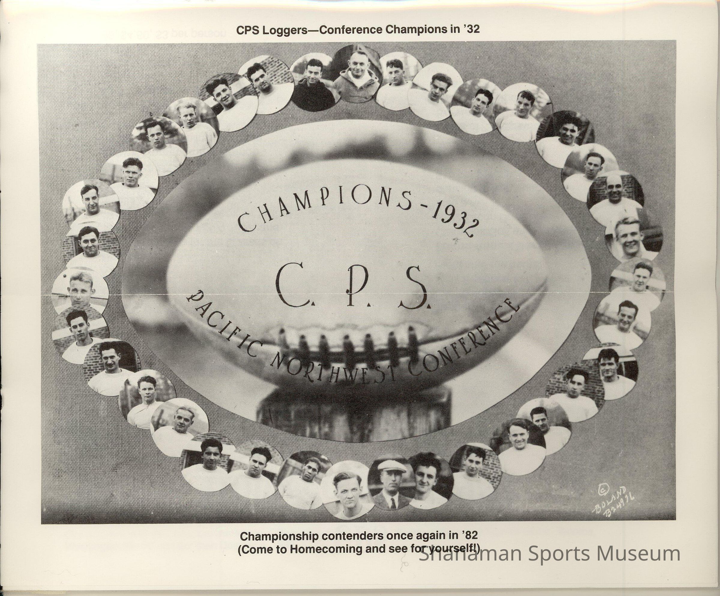Reproduction print on a brochure/mailer from the University of Puget Sound campaigning for the 1982 homecoming. B/w photo of a football reading "champions 1932 C.P.S. Pacific Northwest Conference" with the faces of the 1932 players and coaches around the outside of the football.Lexicon