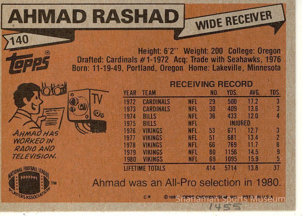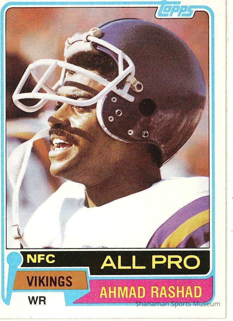 Trading card, football of Ahmad Rashad with the NFC Minnesota Vikings. Rashad was an All-Pro selection in 1980 season.