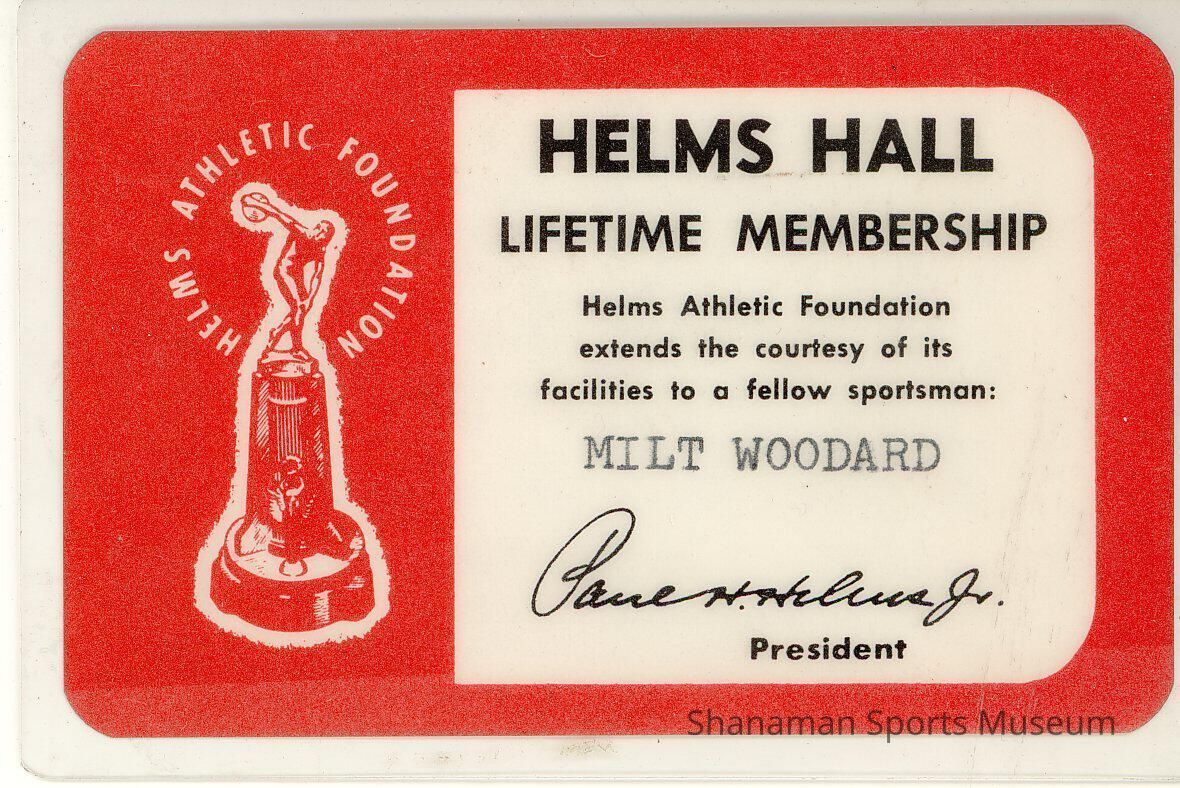 Small card announcing Milt Woodard as Having a lifetime membership in the Helms Hall Athletic FoundationLexicon