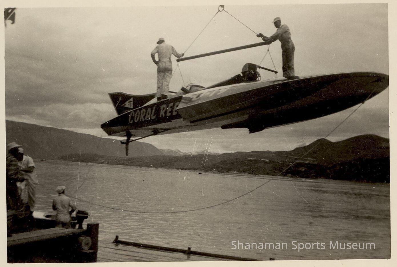 B/W original print of hydroplane Coral Reef. Suspended from crane, lowering down to water.