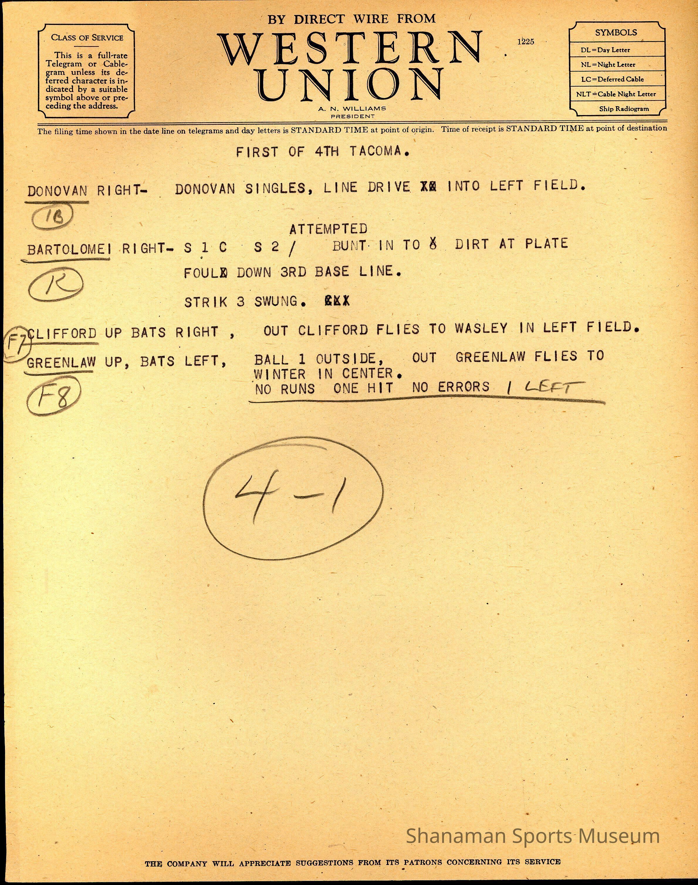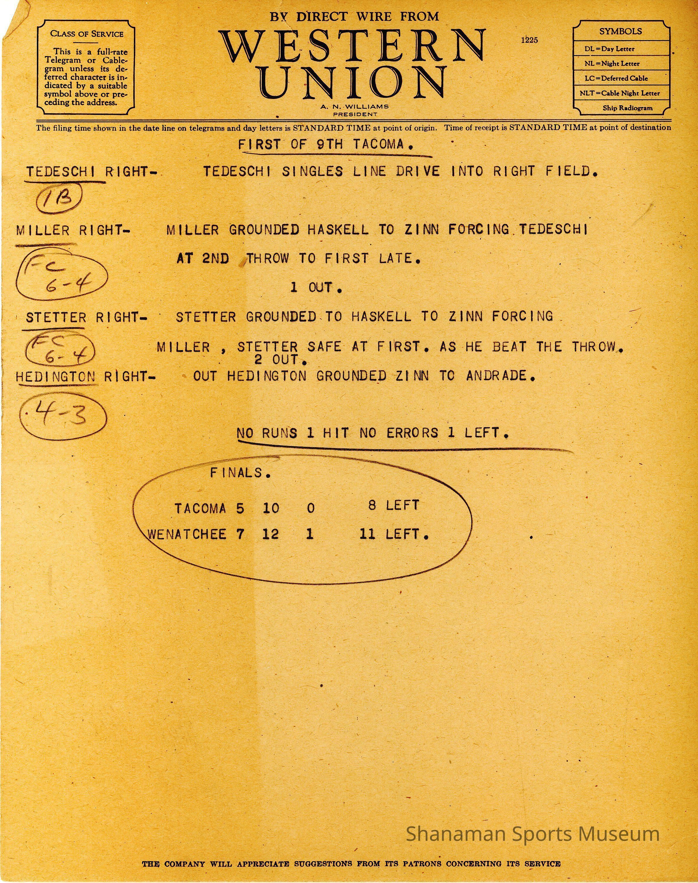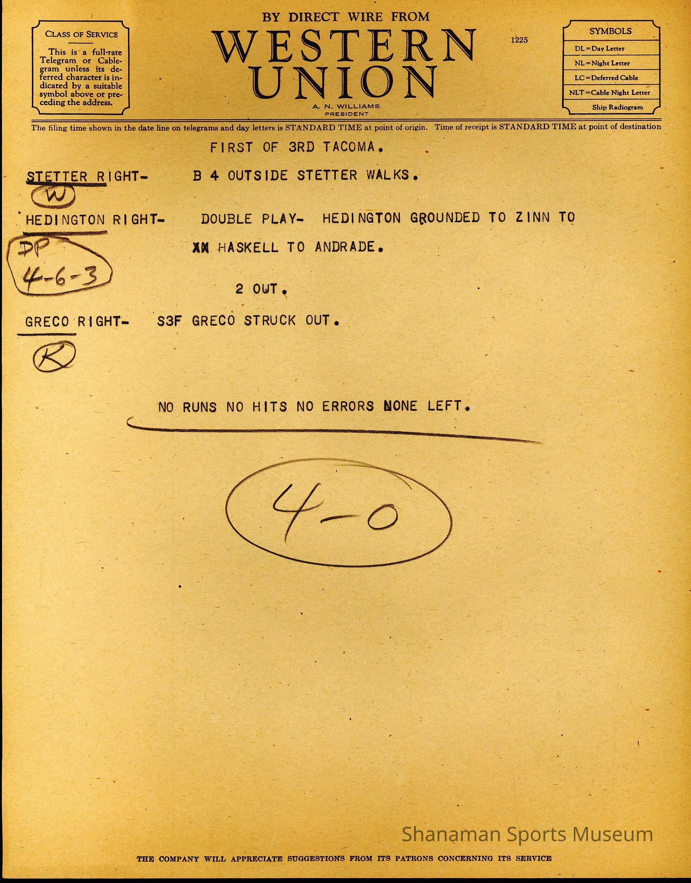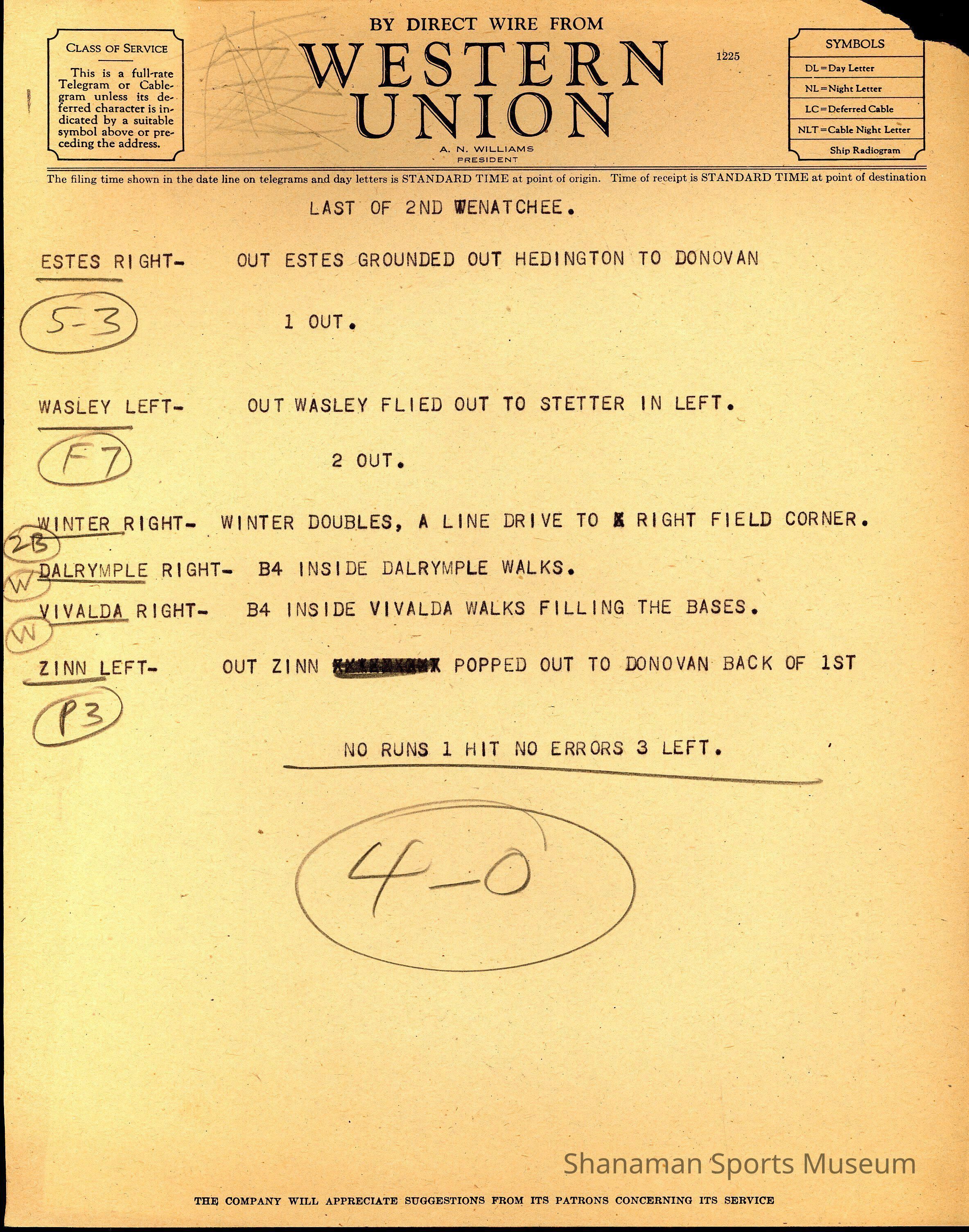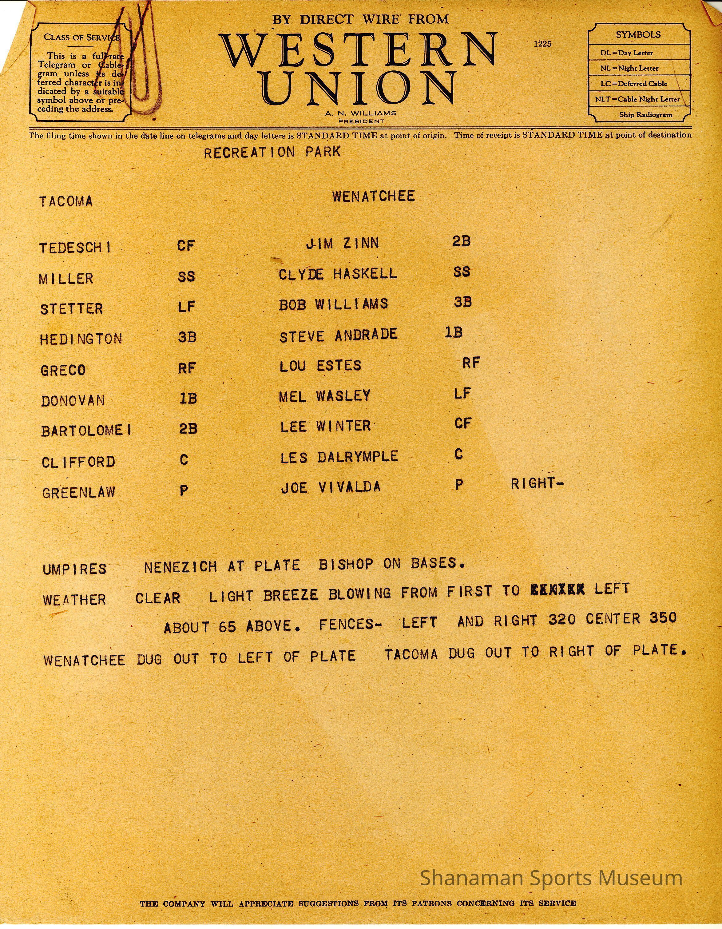 Papers from Western Union from Recreation Park when Tacoma Tigers played the Wenatchee Chiefs in the WIL Clay. Total telegrams: 19.