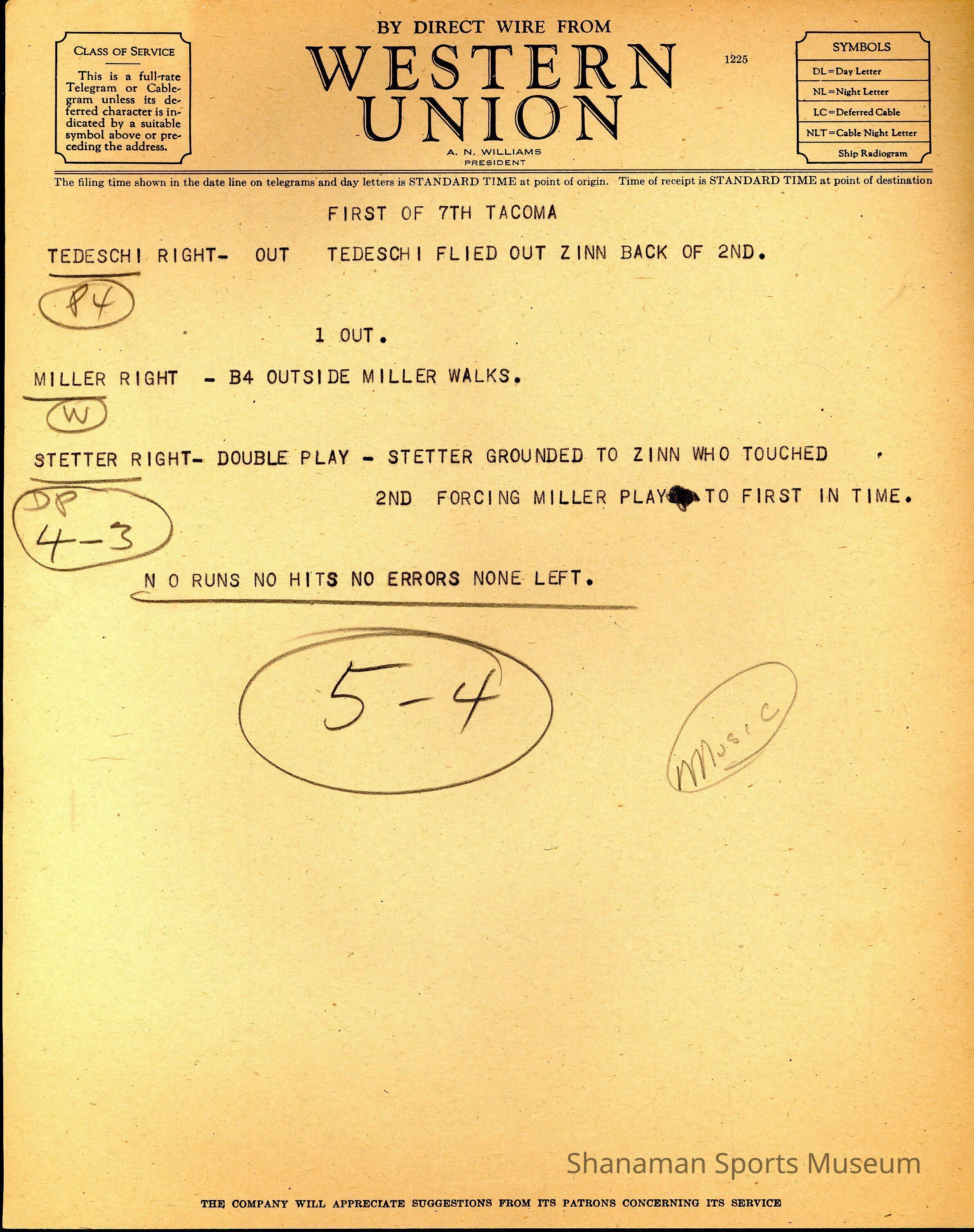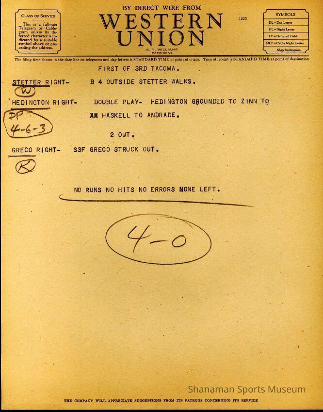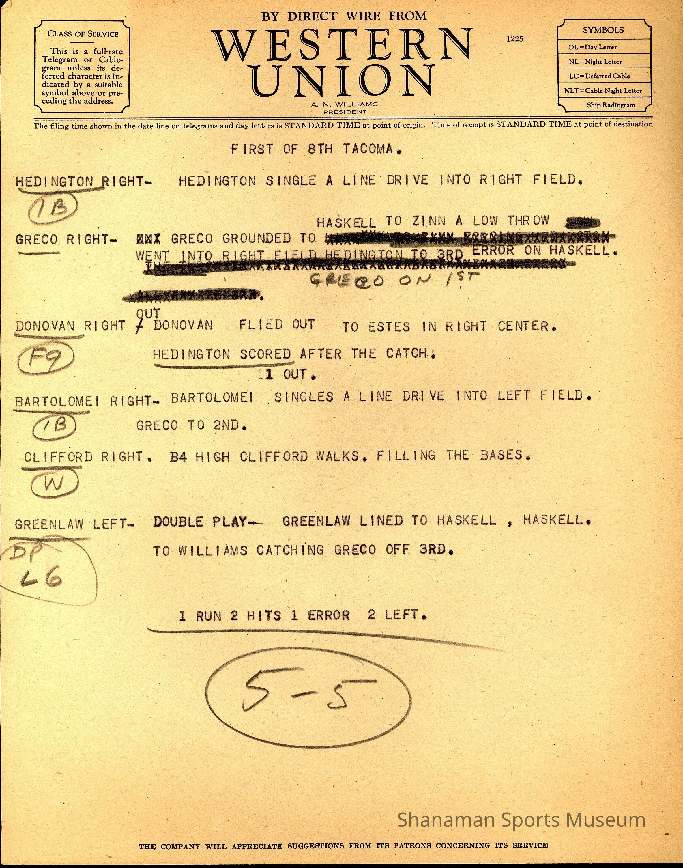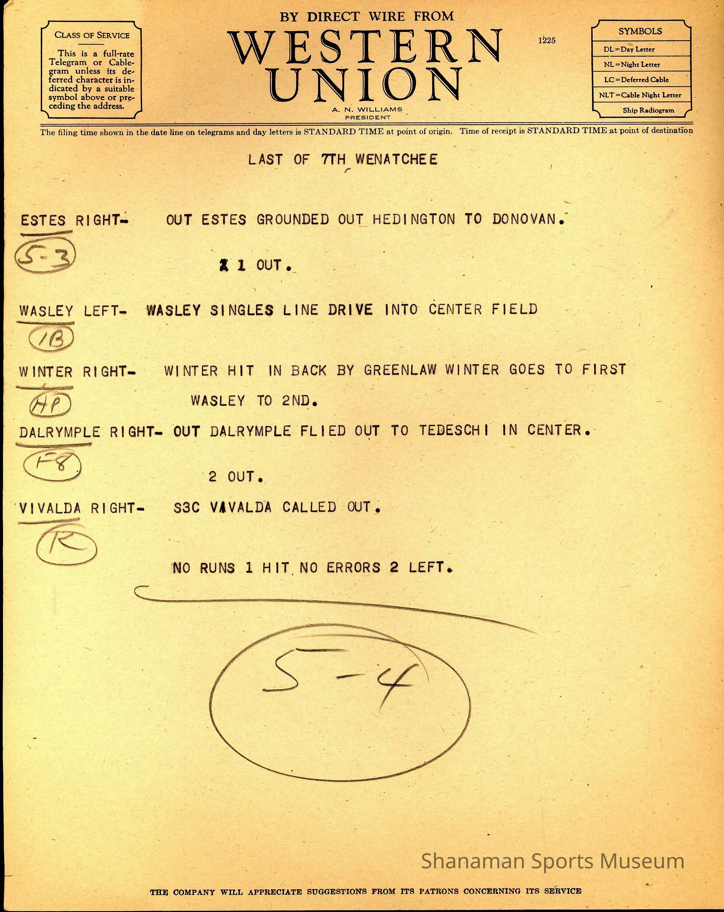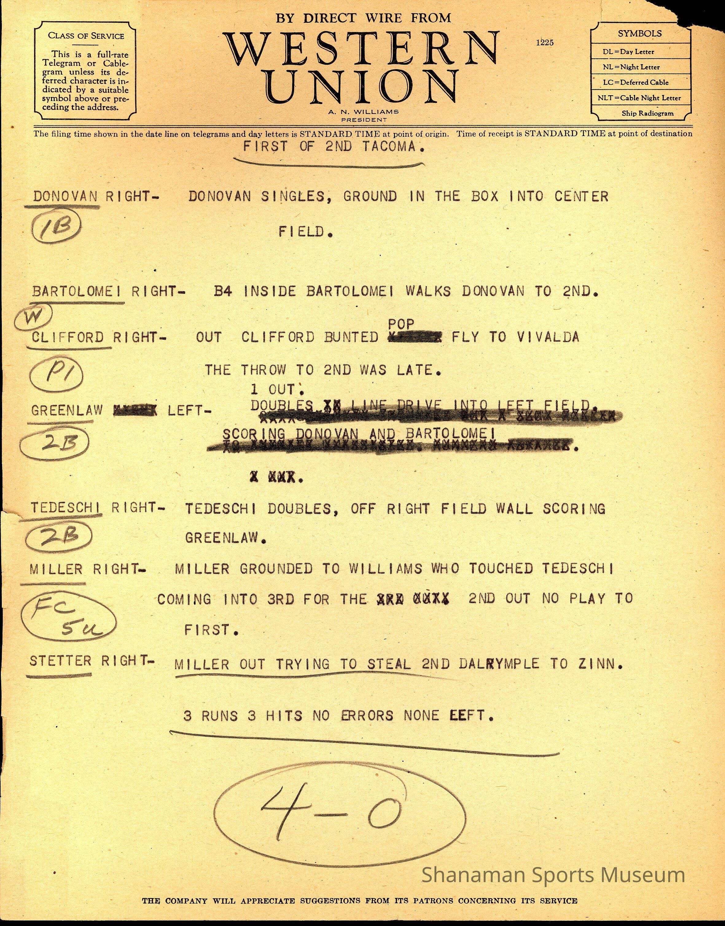 Papers from Western Union from Recreation Park when Tacoma Tigers played the Wenatchee Chiefs in the WIL Clay. Total telegrams: 19.