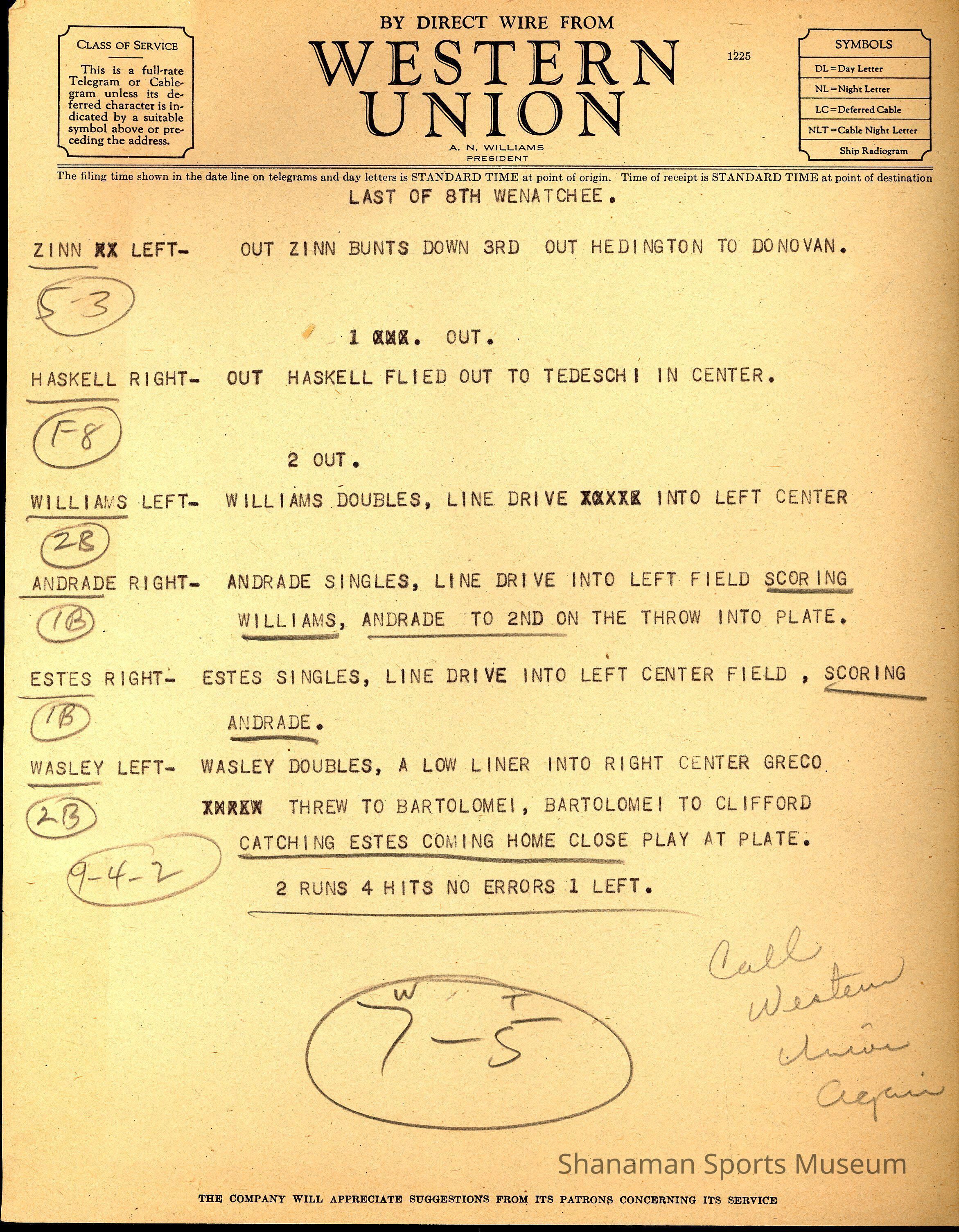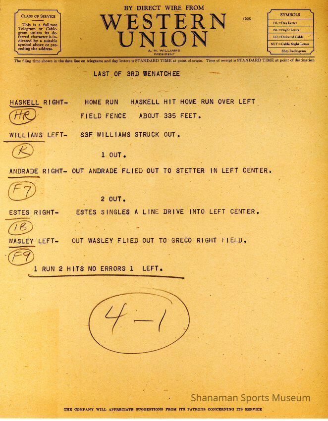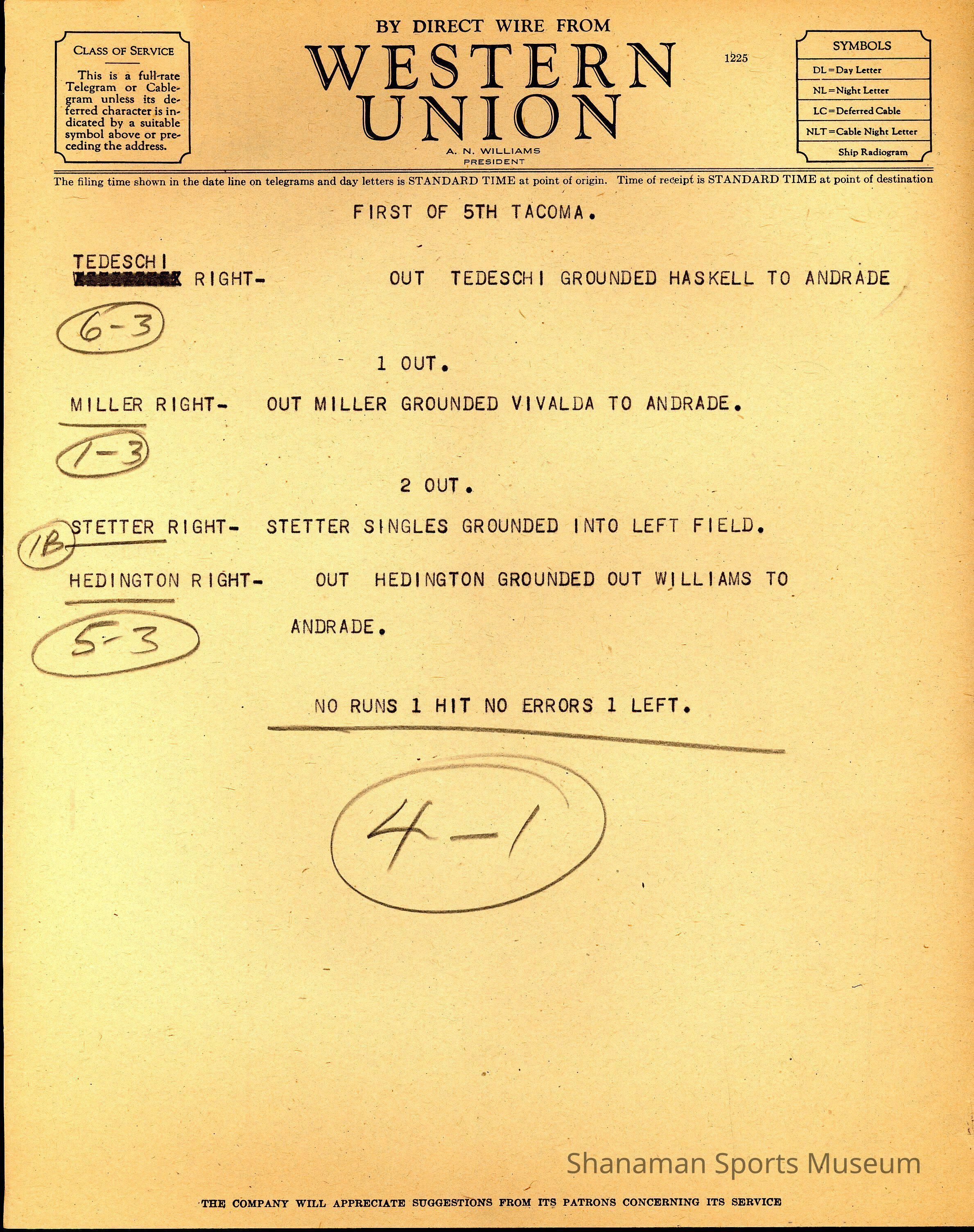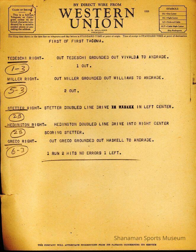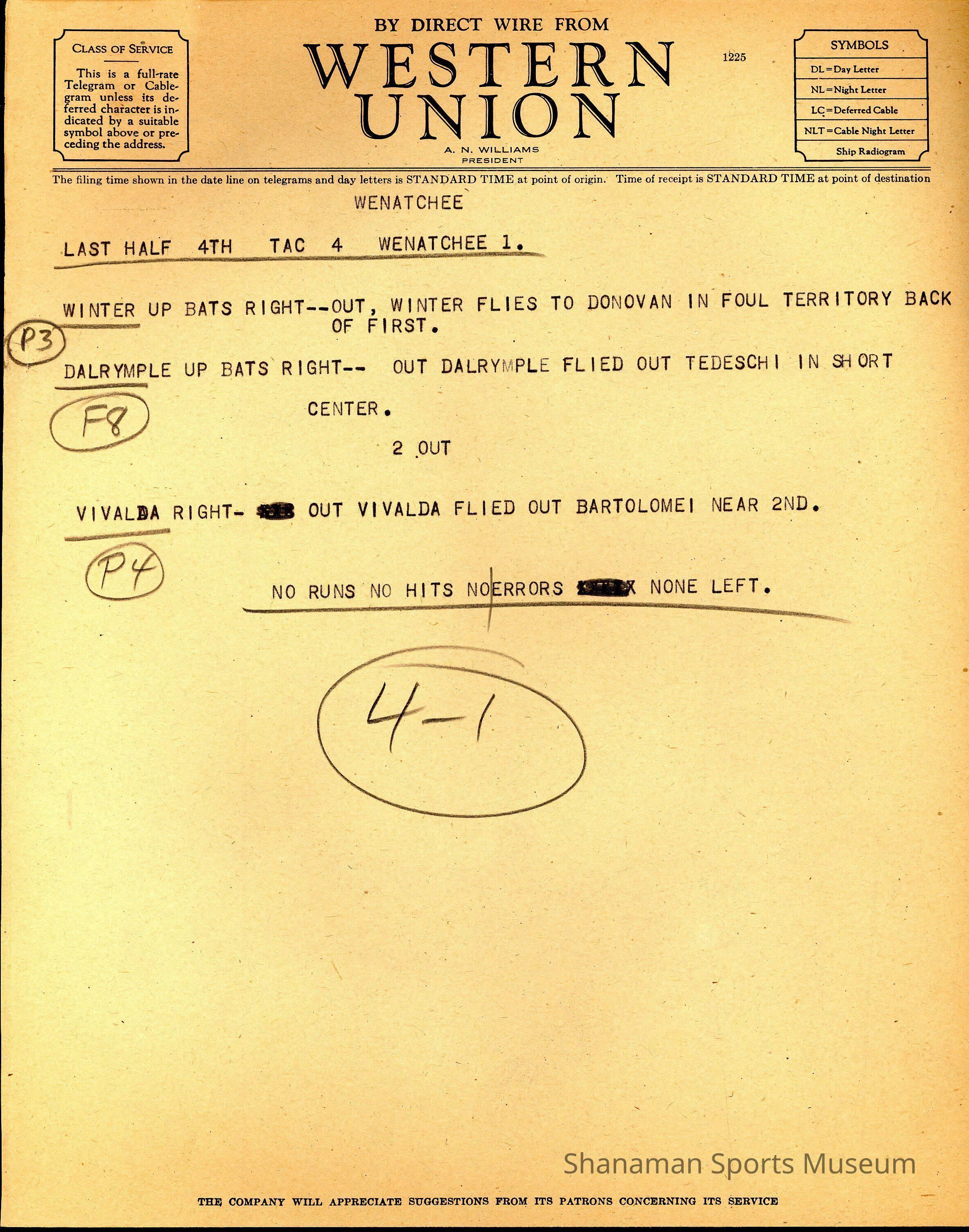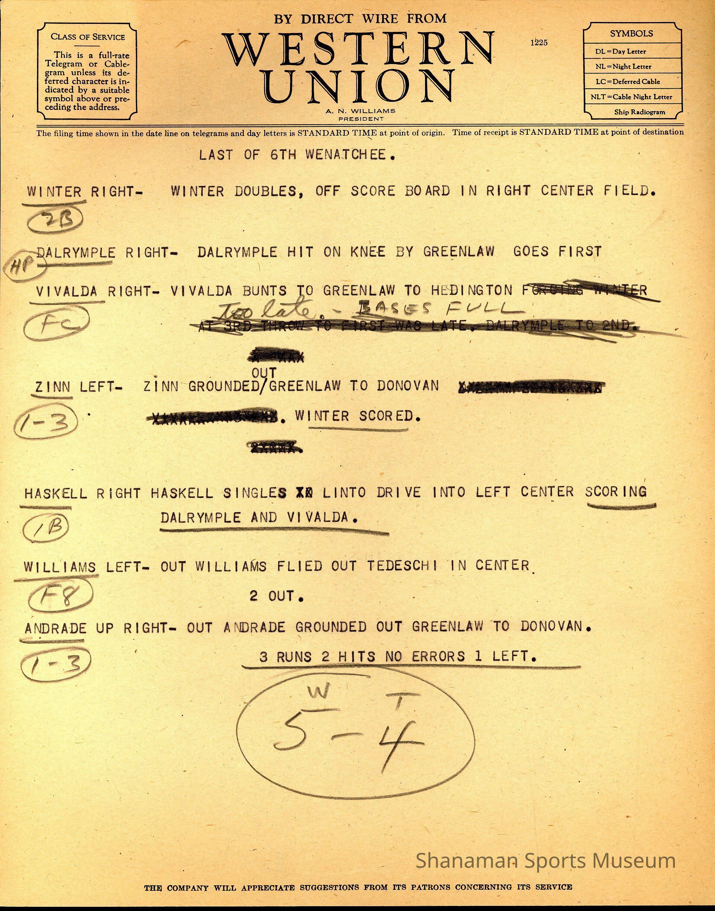Papers from Western Union from Recreation Park when Tacoma Tigers played the Wenatchee Chiefs in the WIL Clay. Total telegrams: 19.