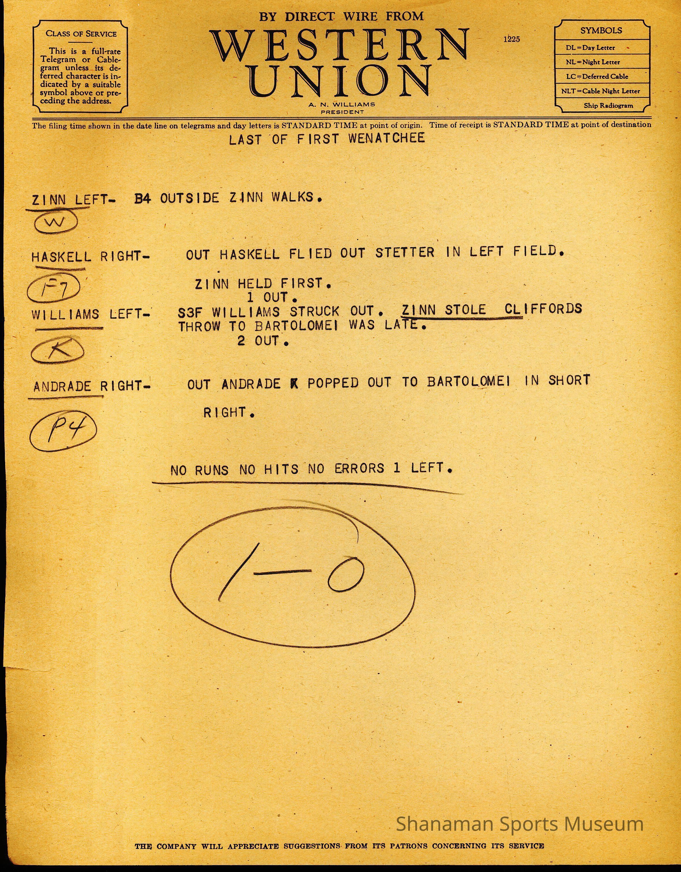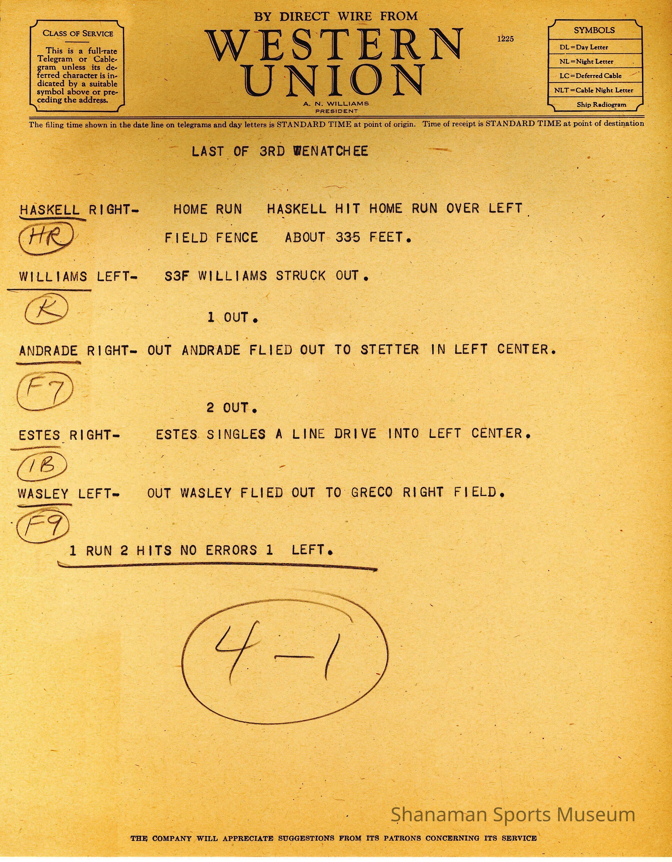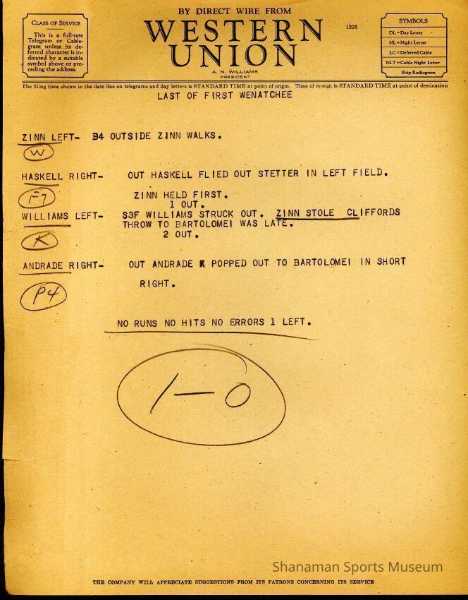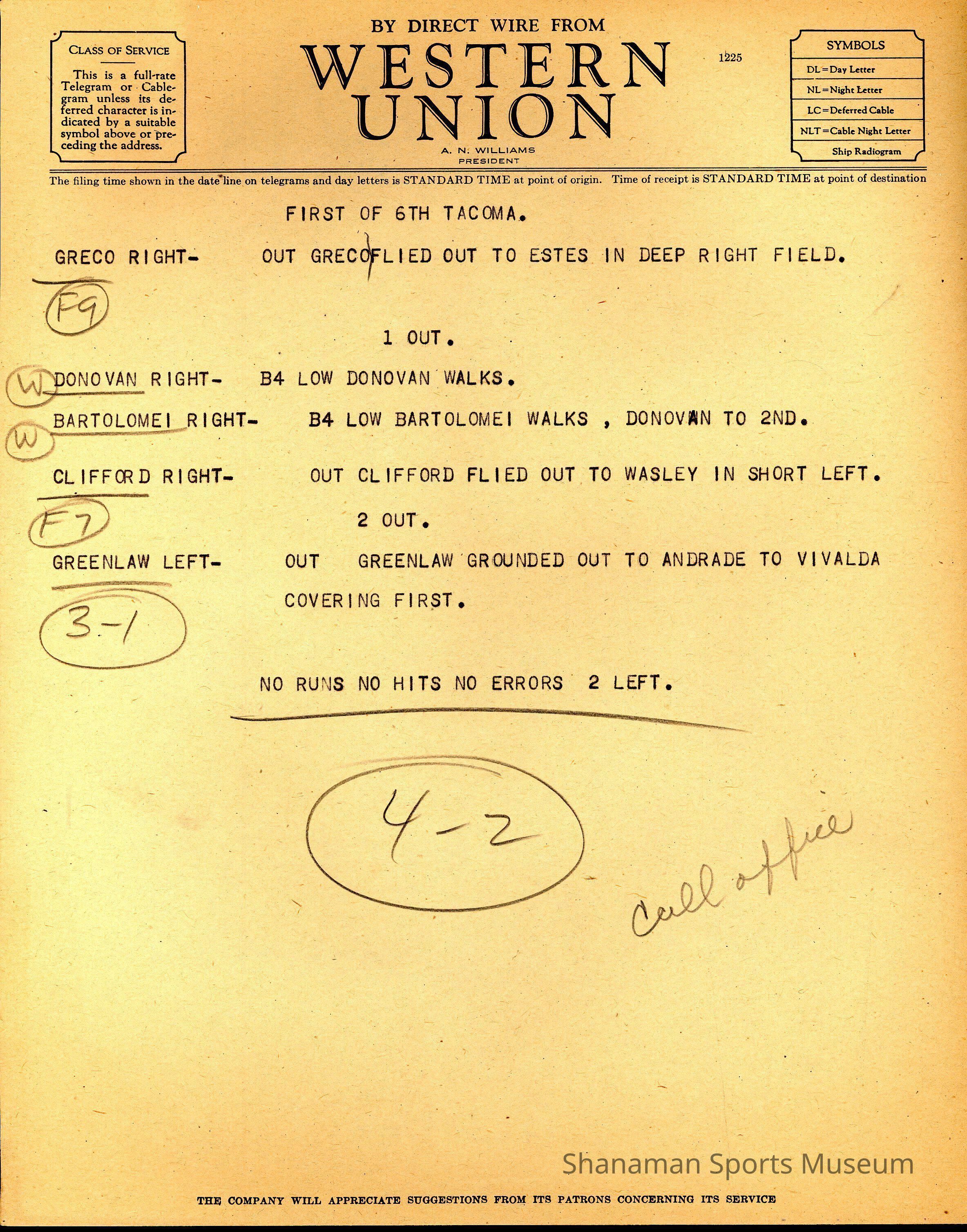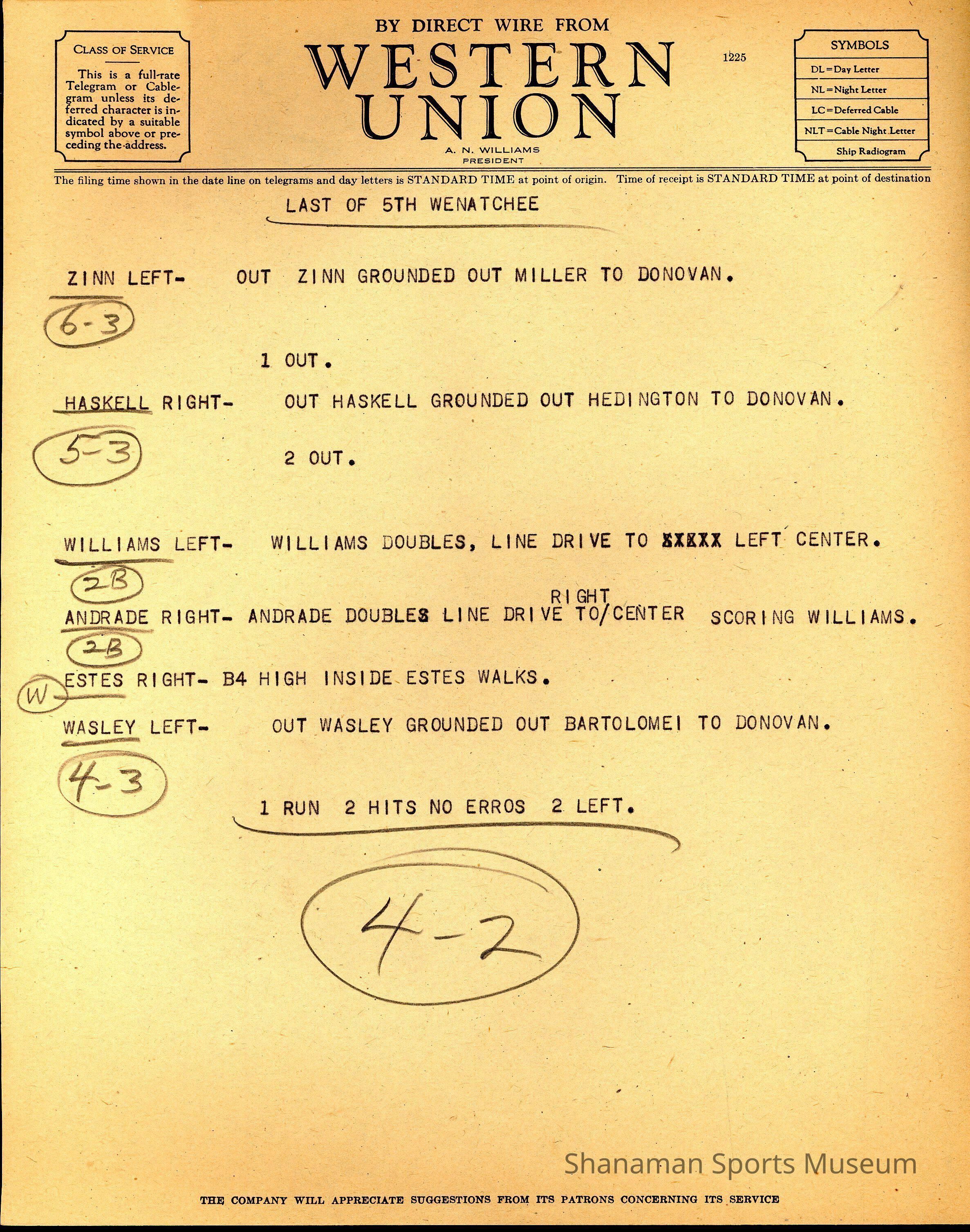Papers from Western Union from Recreation Park when Tacoma Tigers played the Wenatchee Chiefs in the WIL Clay. Total telegrams: 19.
