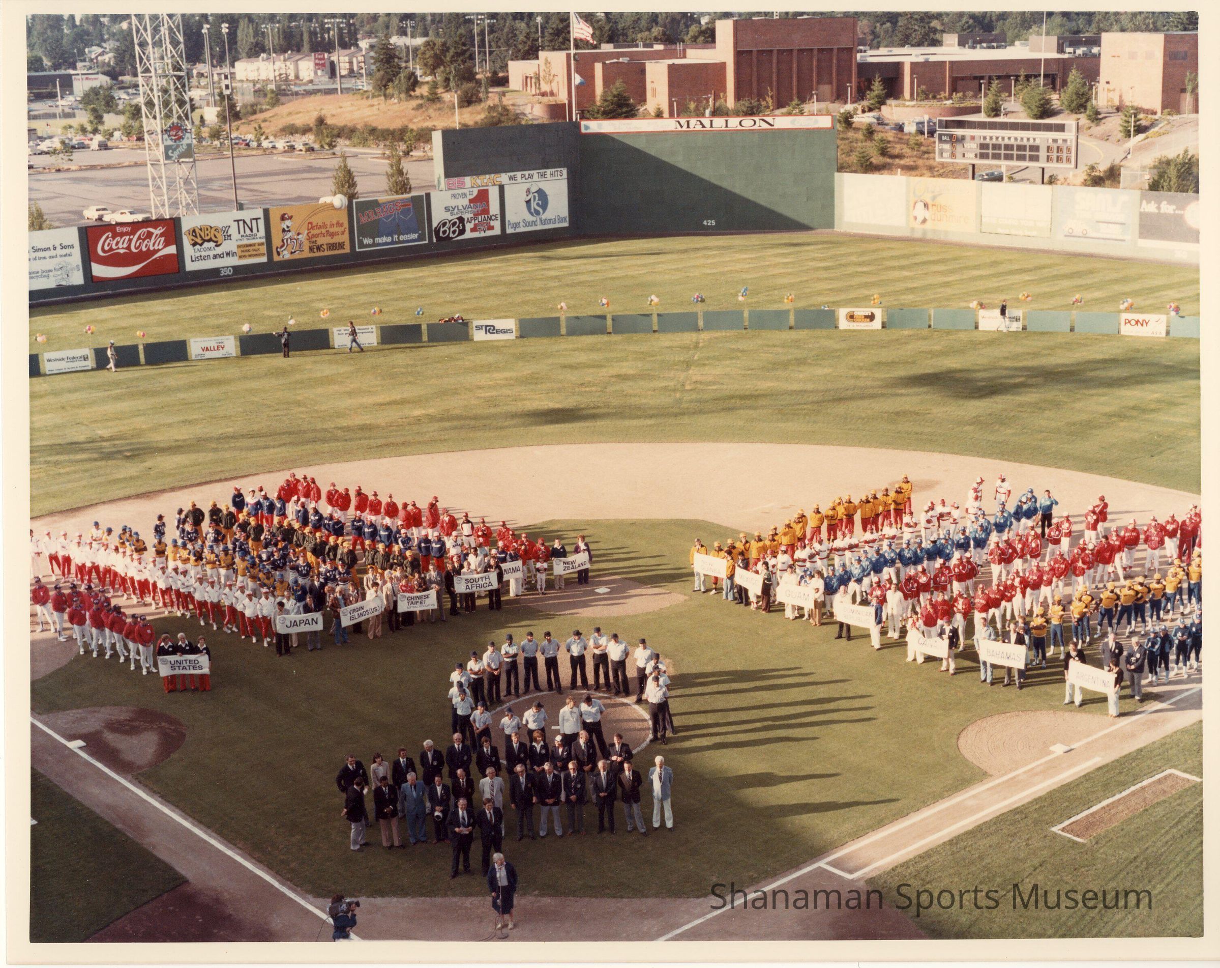 Fourteen teams line up -- seven each between third and second base, and second and first base -- for the 1985 American Softball Association (ASA) fastpitch world tournament at Cheney Stadium.