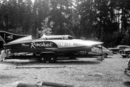 B/W original print, hydroplane Miss Rocket on trailer. Side profile view, "Miss Rocket" & "U-19" along beam. Man in white coveralls sits at back edge of trailer.Lexicon