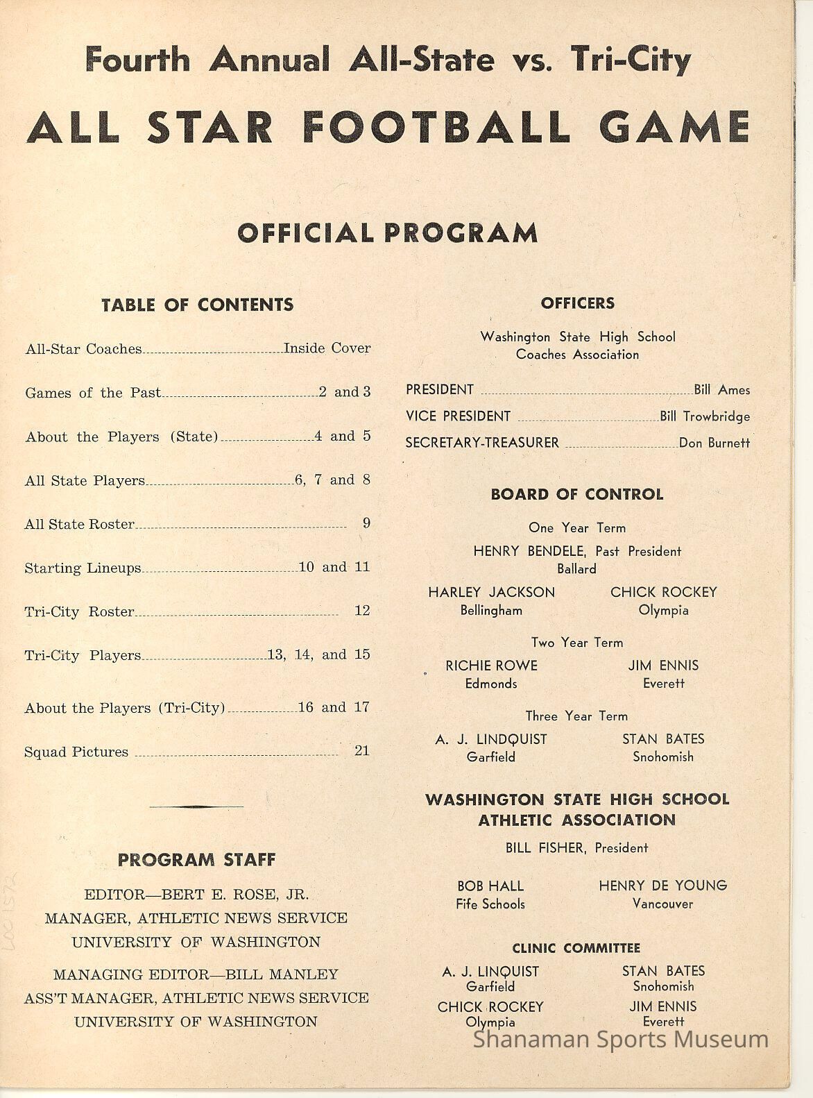 1950 State vs Tri-City football program. Cover is missing. Local Tacoman participating included Sid Names from Puyallup