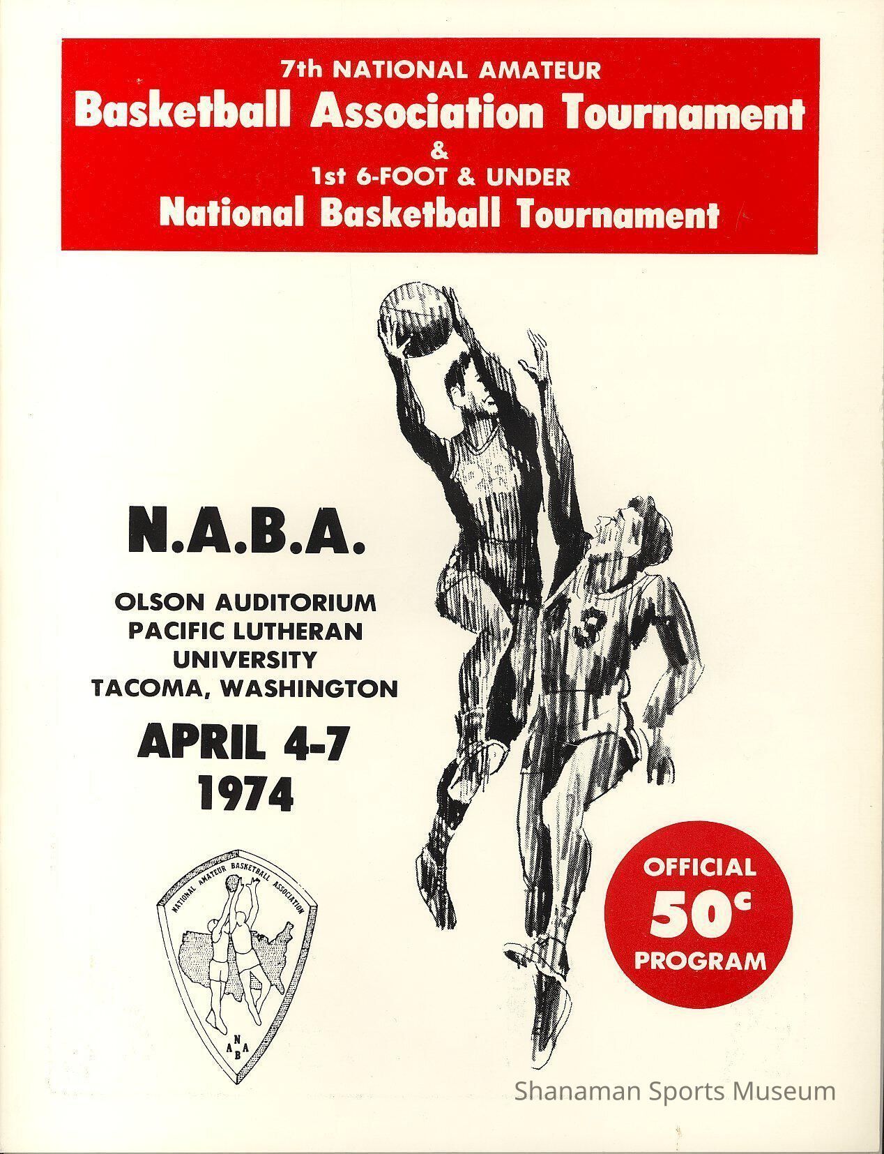 "7th National Amateur Basketball Assoc. Tournement"; White cover with 2 players drawn as rough charcoal sketch. Held at P.L.U. April '74