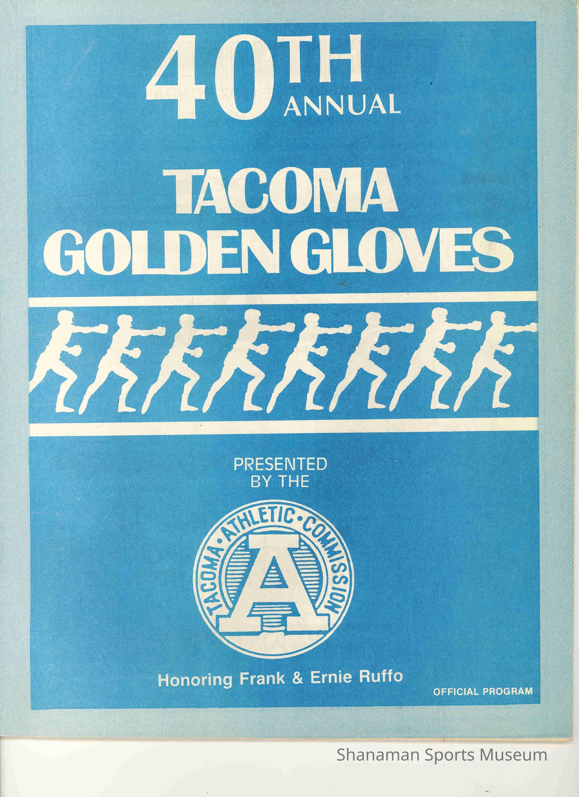 "40th Annual Tacoma Golden Gloves" Printed on newsprint; Cover is bright blue with light blue borders. Silhouettes of boxers; honors Frank and Ernie Ruffo.
